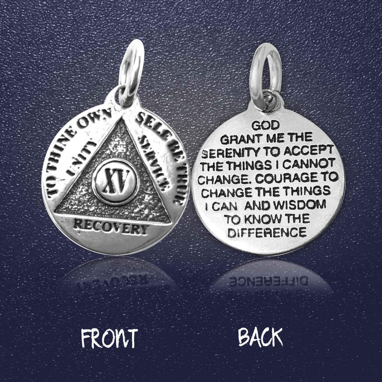 Finally...the right size AA Medallion pendant!! Celebrate your recovery or give a gift to that special someone with these anniversary pendants/charms. We designed them as a smaller version of the pocket medallions so they can be held close and worn in celebration of our "new" way of life. Each Medallion has the Serenity Prayer on the back. The front has an inscribed triangle with unity, recovery & service Along the top edge is are the words "To thine own self be true". Years 1-40 are available as well as a twenty-four hour medallion(24) signifying the importance of one day at a time. These pendants are made of high quality sterling silver and are the perfect gifts to collect or pass on!! These are great by themselves and can also add that something personal to another piece. Robert loves to wear the 24hr medallion with his large Dog Tag for the Soul, while Michelle has a medallion and charm bracelet. Mix, match and enjoy!