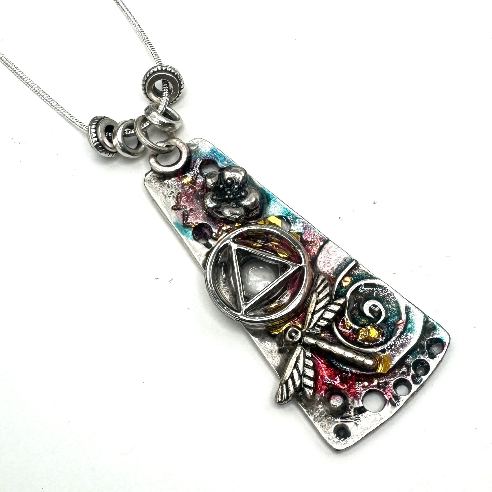 Elevate your style with unique hand-painted resin pendant necklaces! Each piece is a miniature work of art, perfect for expressing your journey in recovery. 18” silver plated chain. Your sure to love this one of a kind pendant necklace by Michelle b
