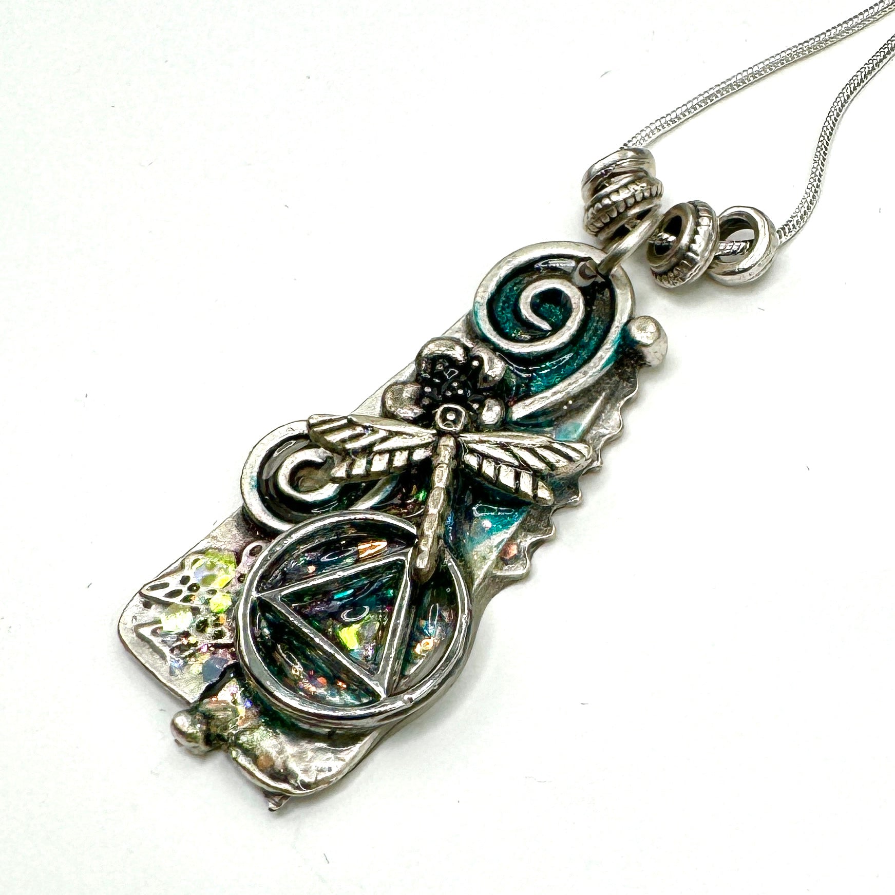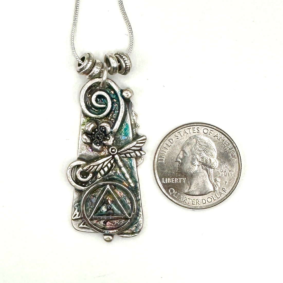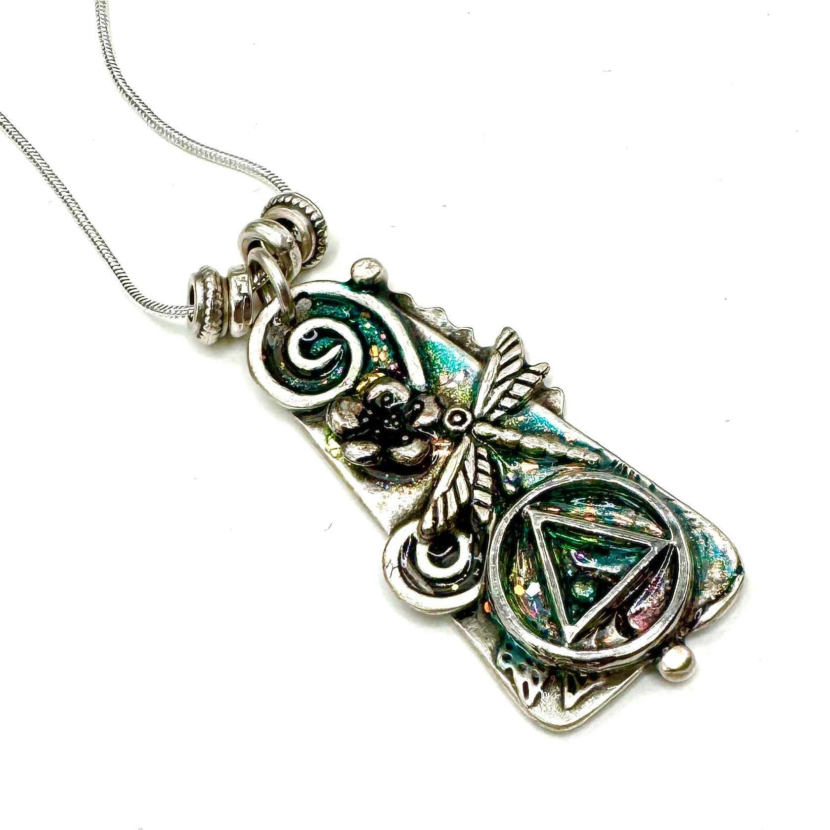 Silver plated 18” chain. This is a One of a Kind Pendant that’s sure to stand out!