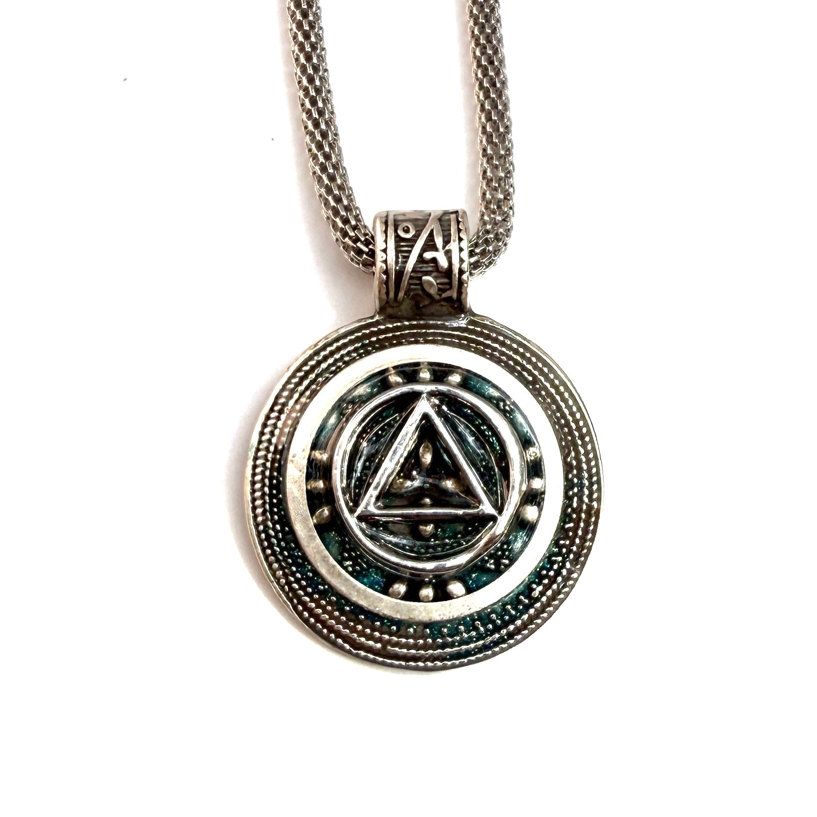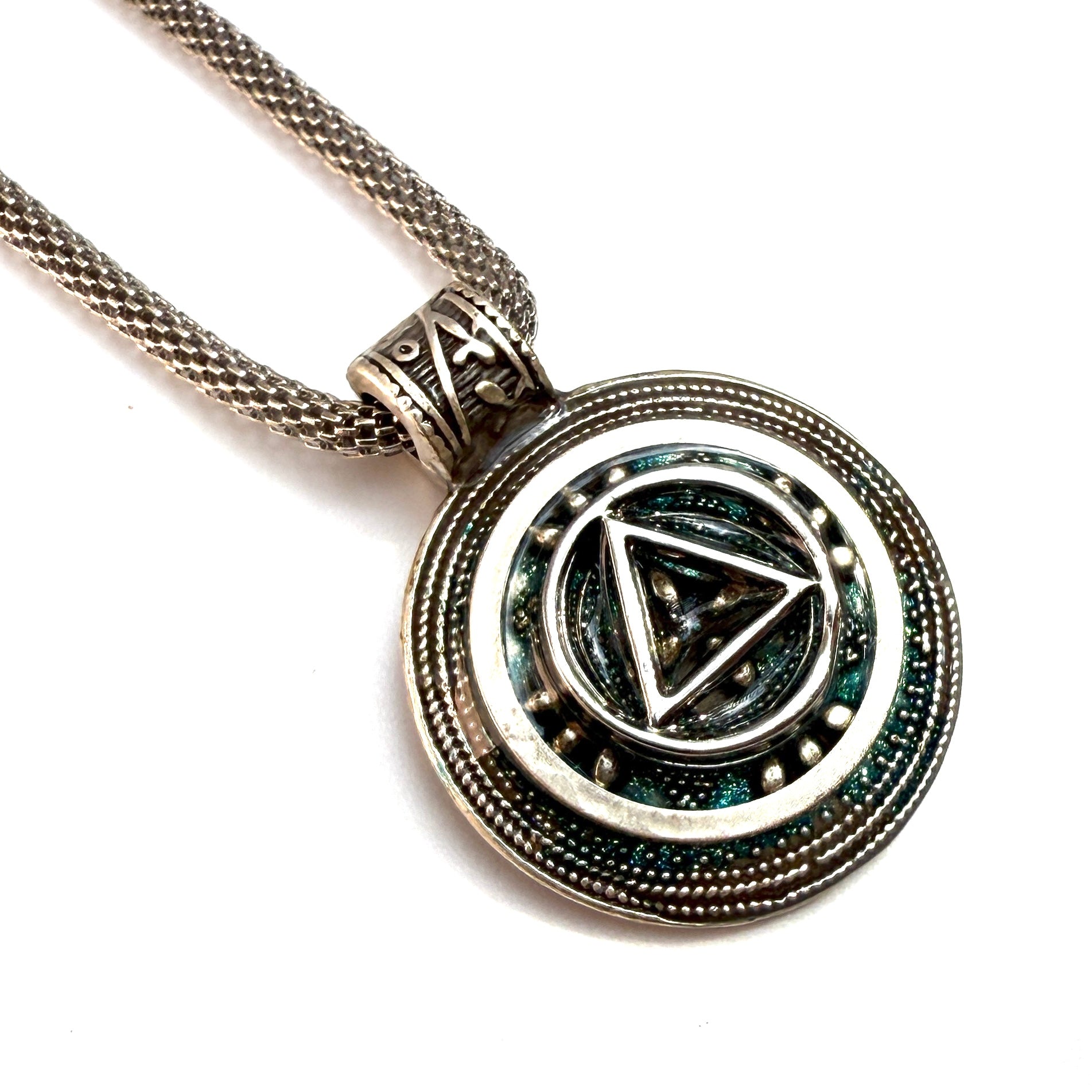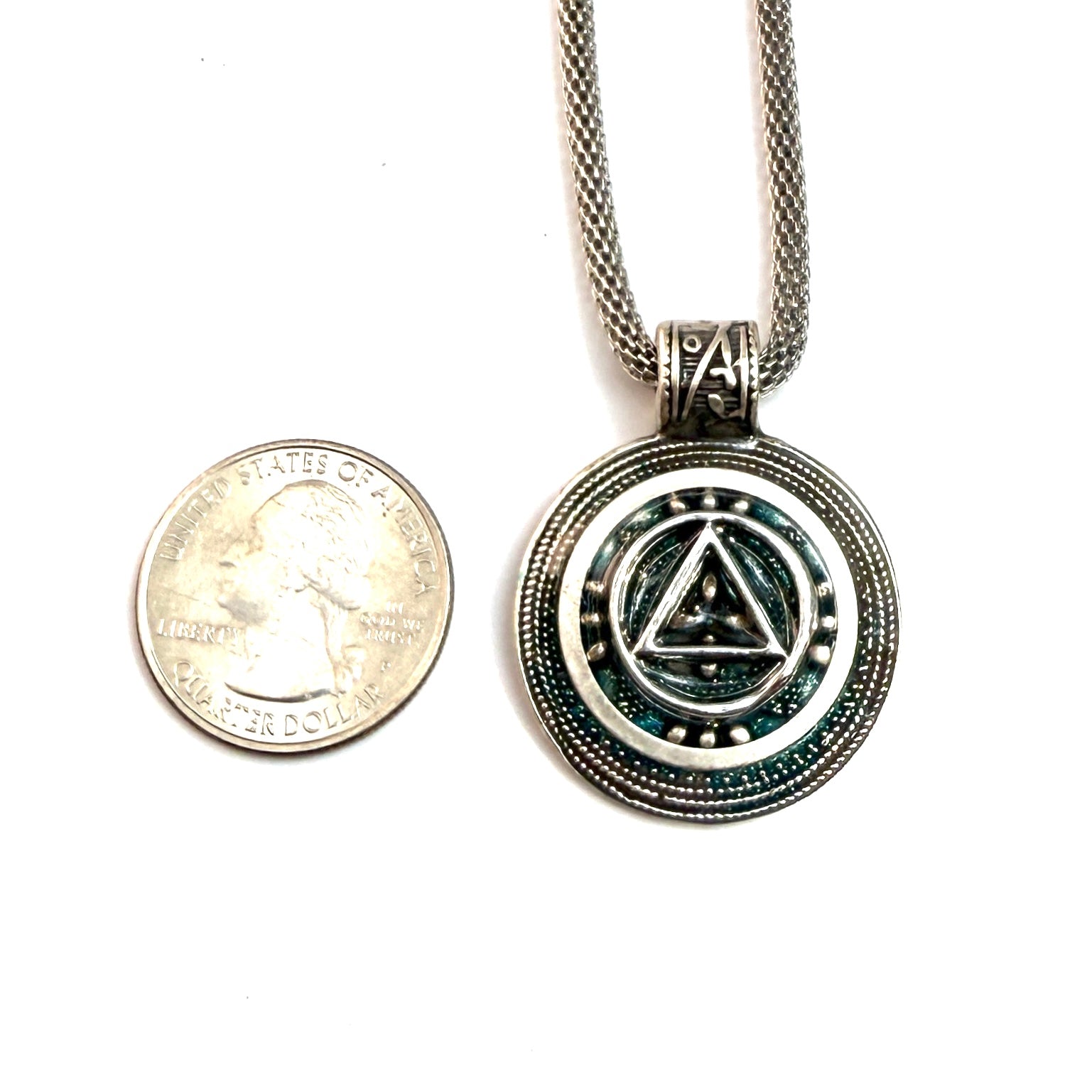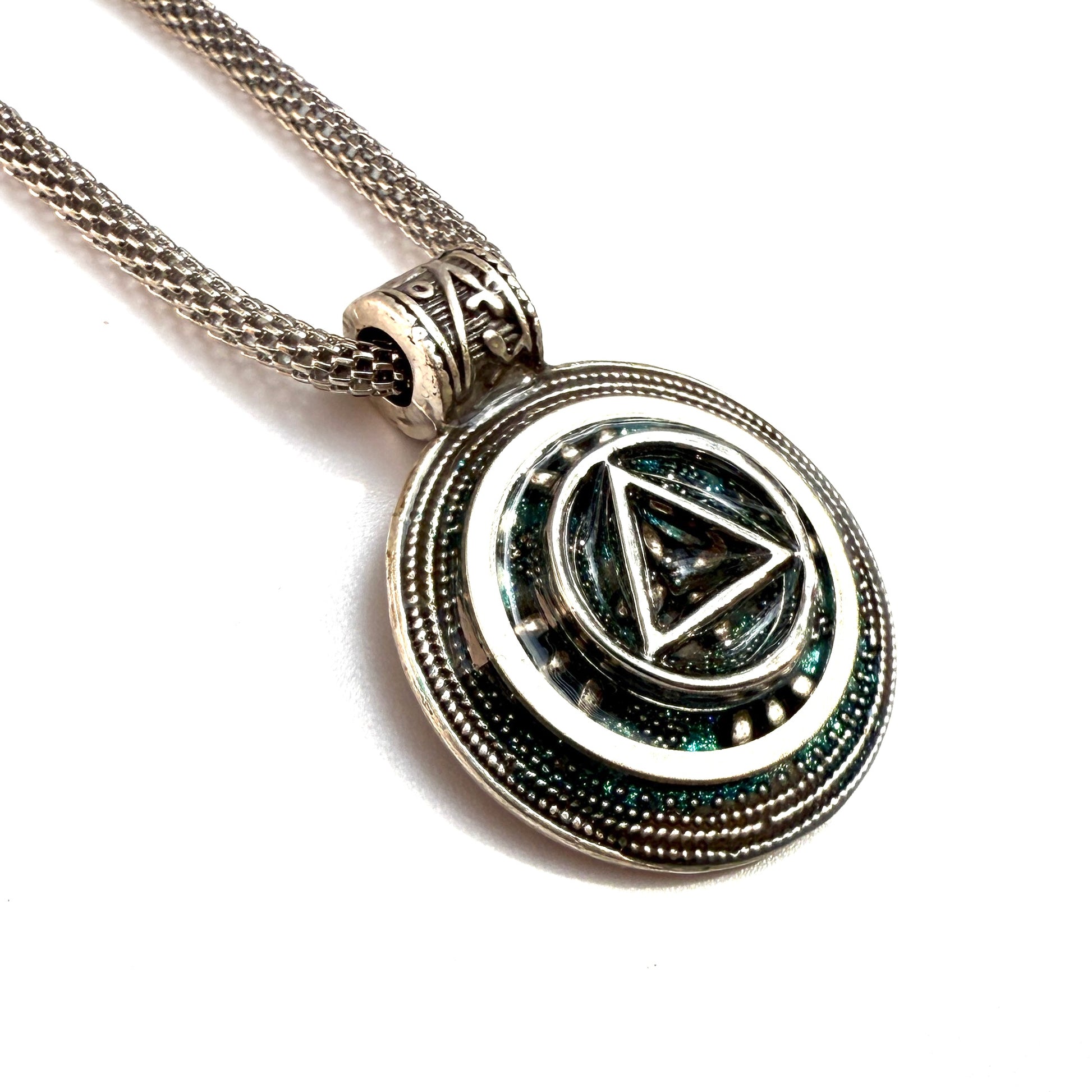 Silver plated 18” chain. This is a One of a Kind Pendant that’s sure to stand out!