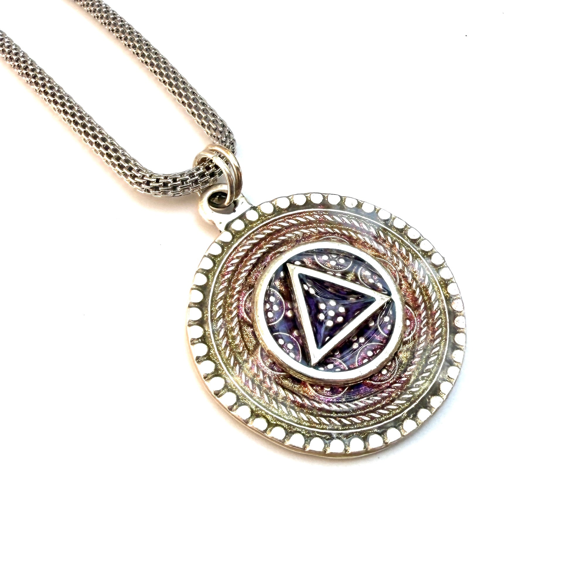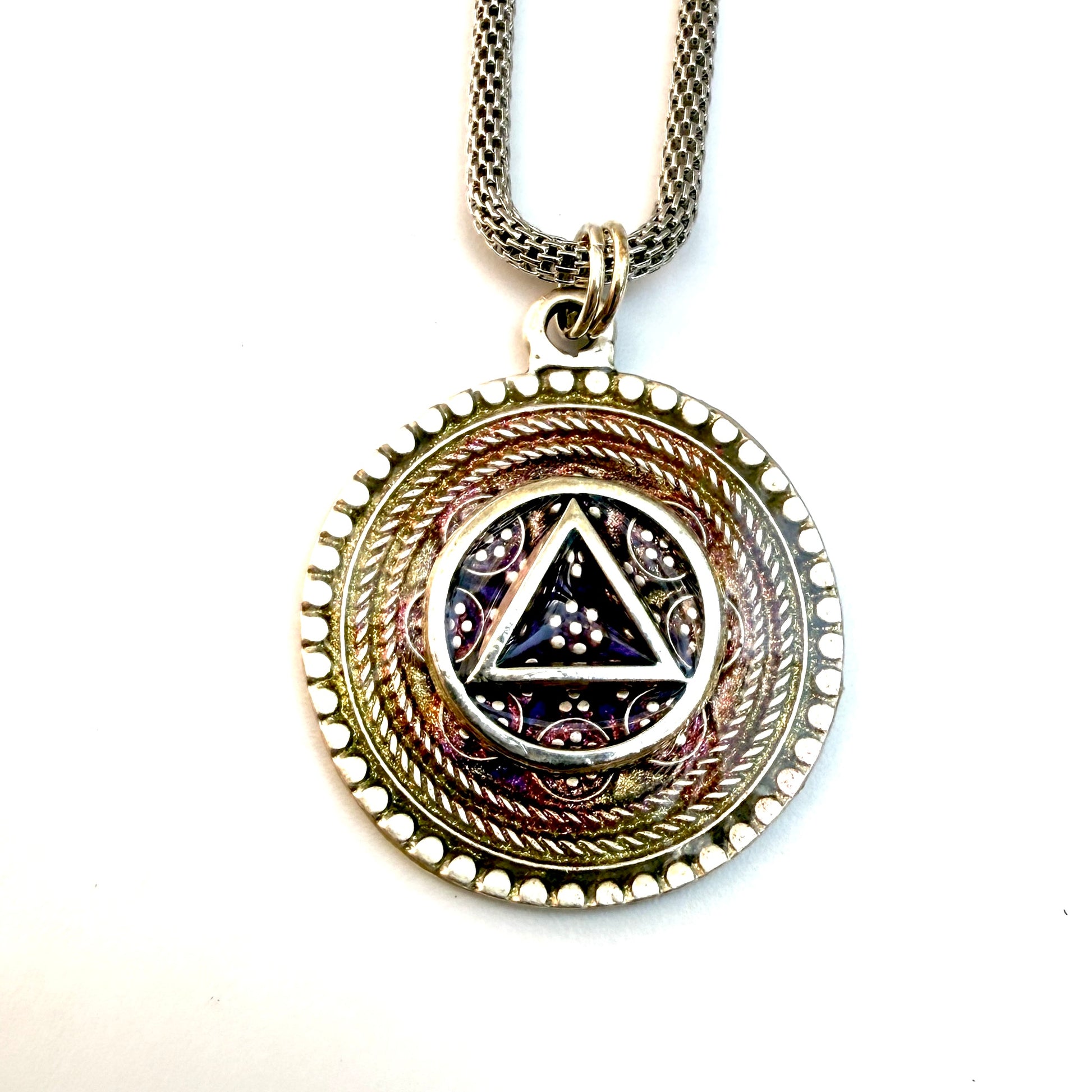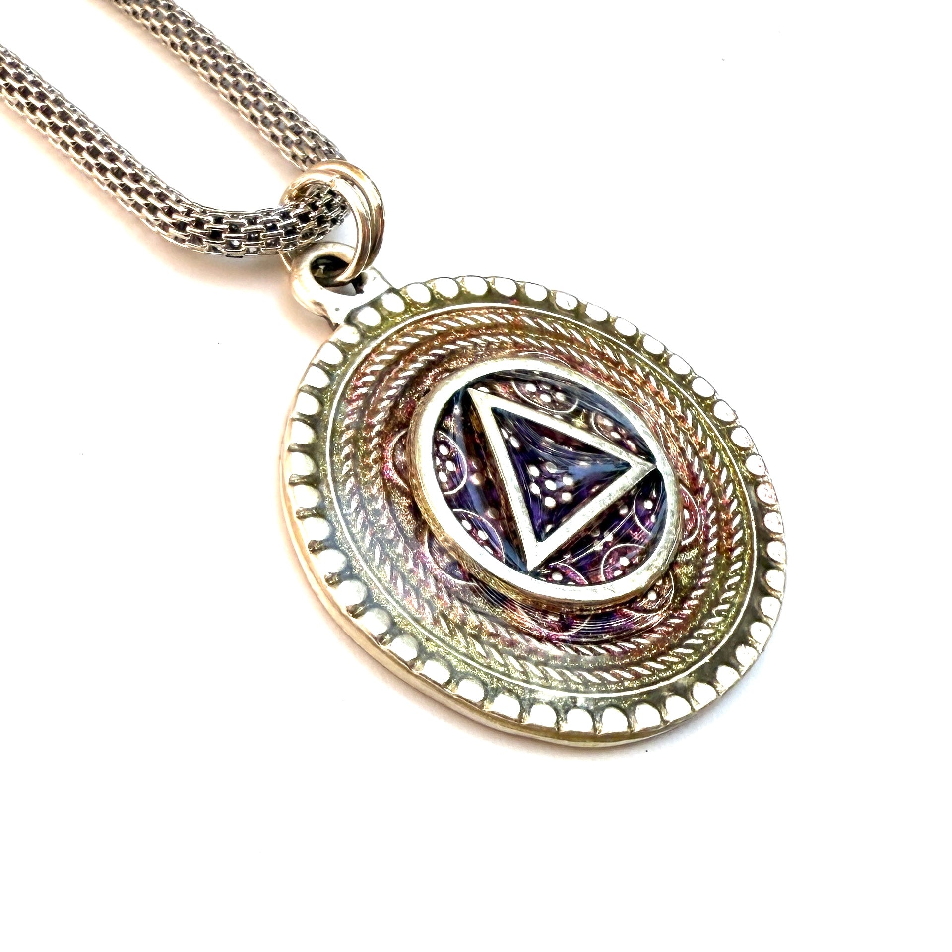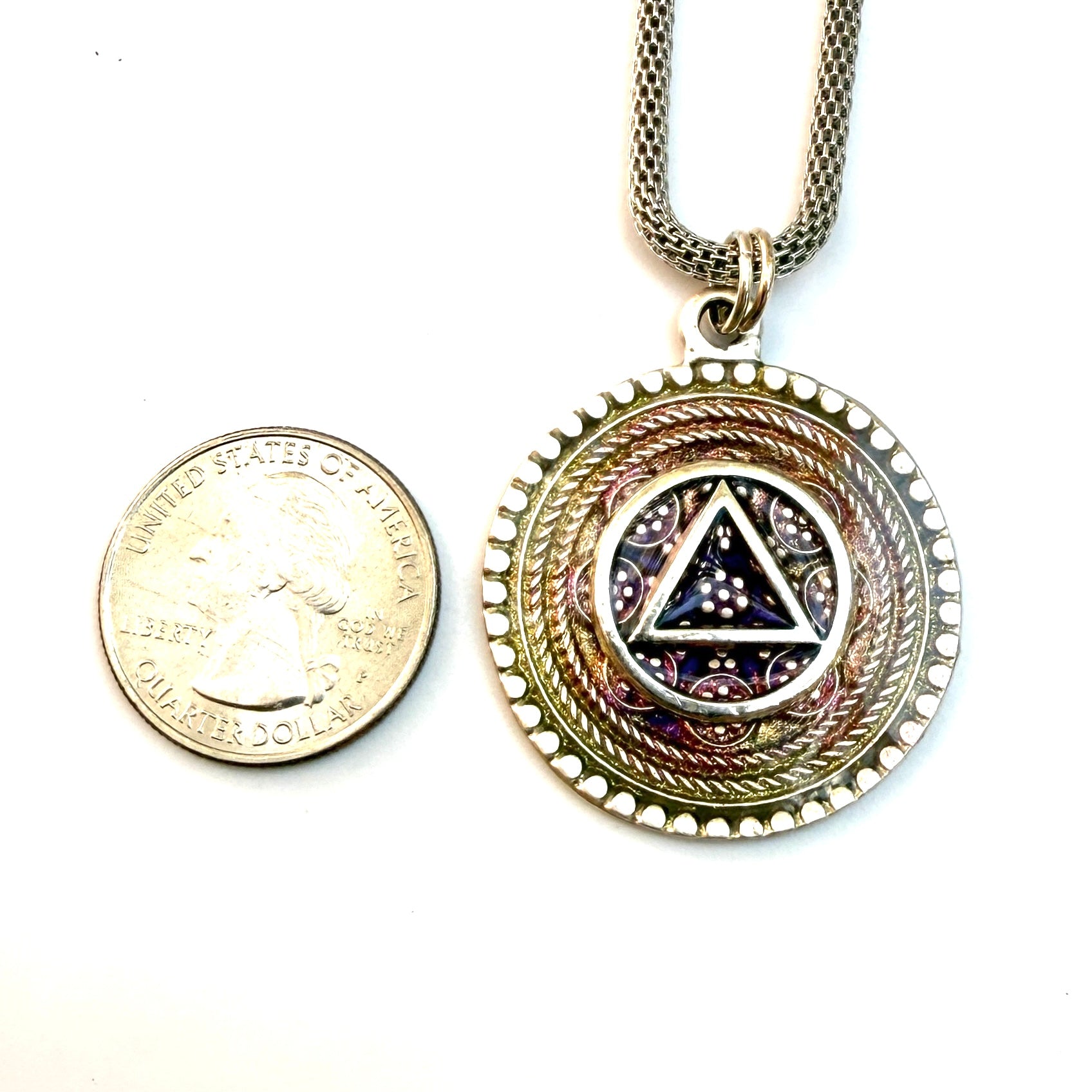 Silver plated 18” chain. This is a One of a Kind Pendant that’s sure to stand out!
