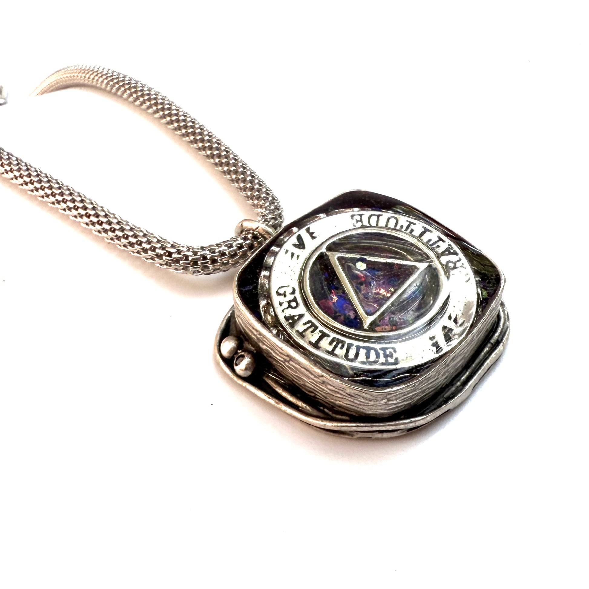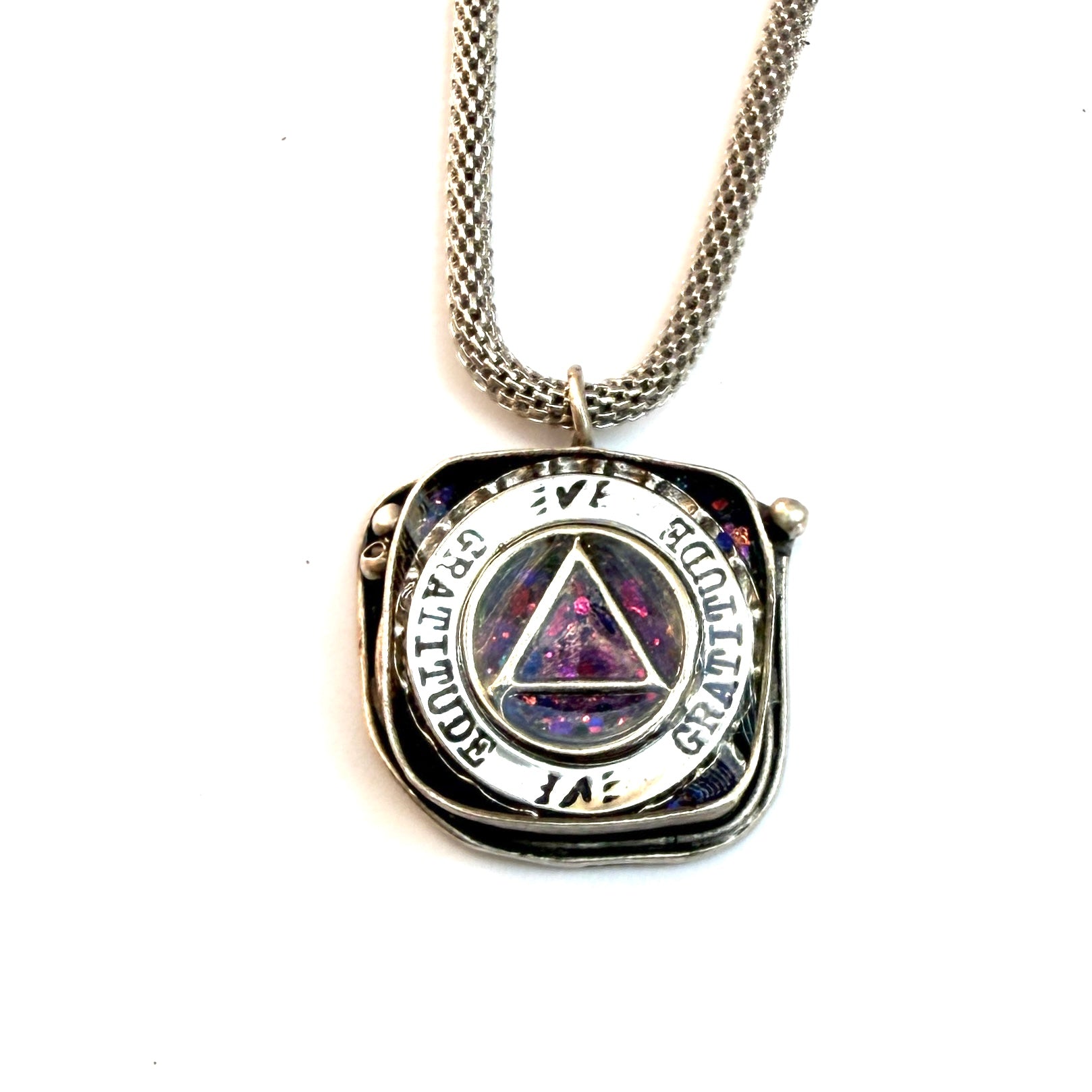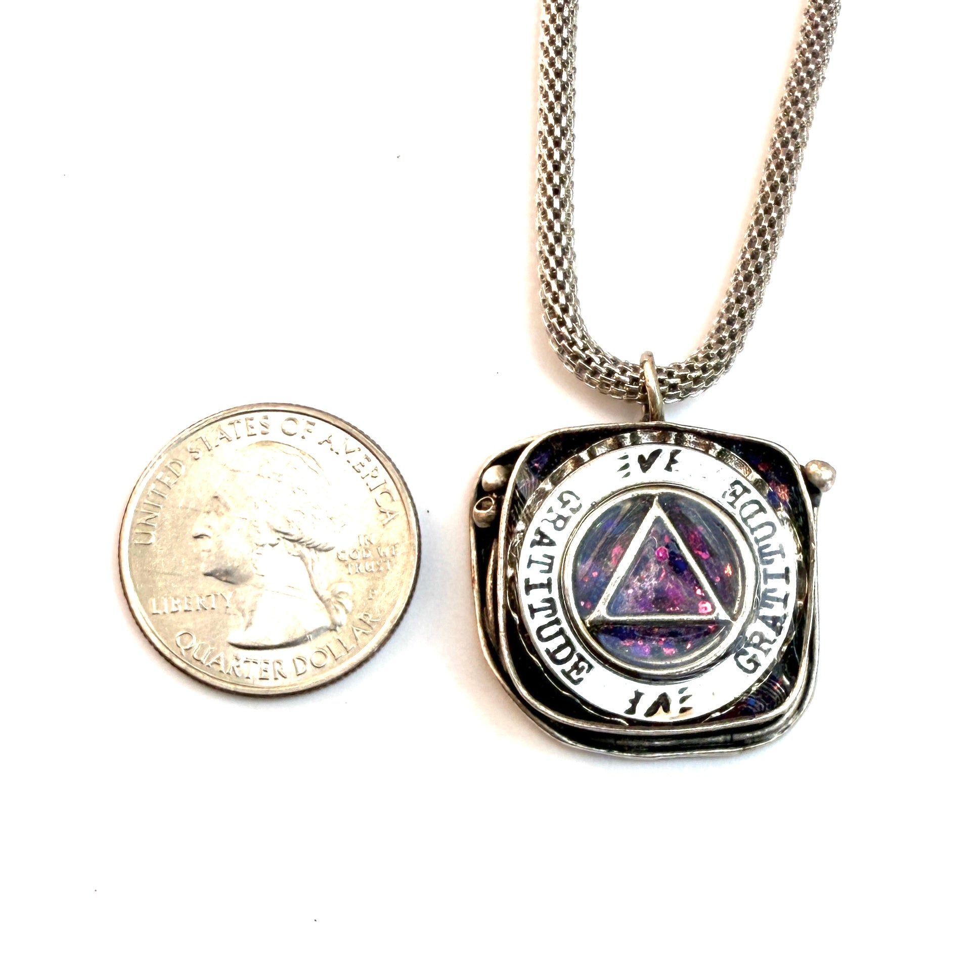 Silver plated 18” chain. This is a One of a Kind Pendant that’s sure to stand out!