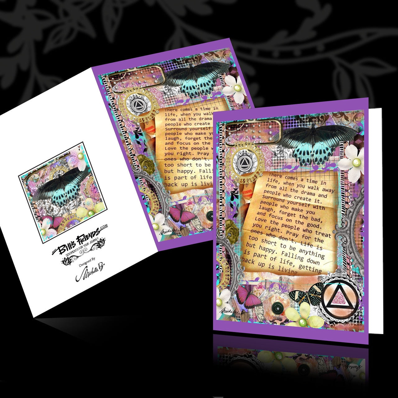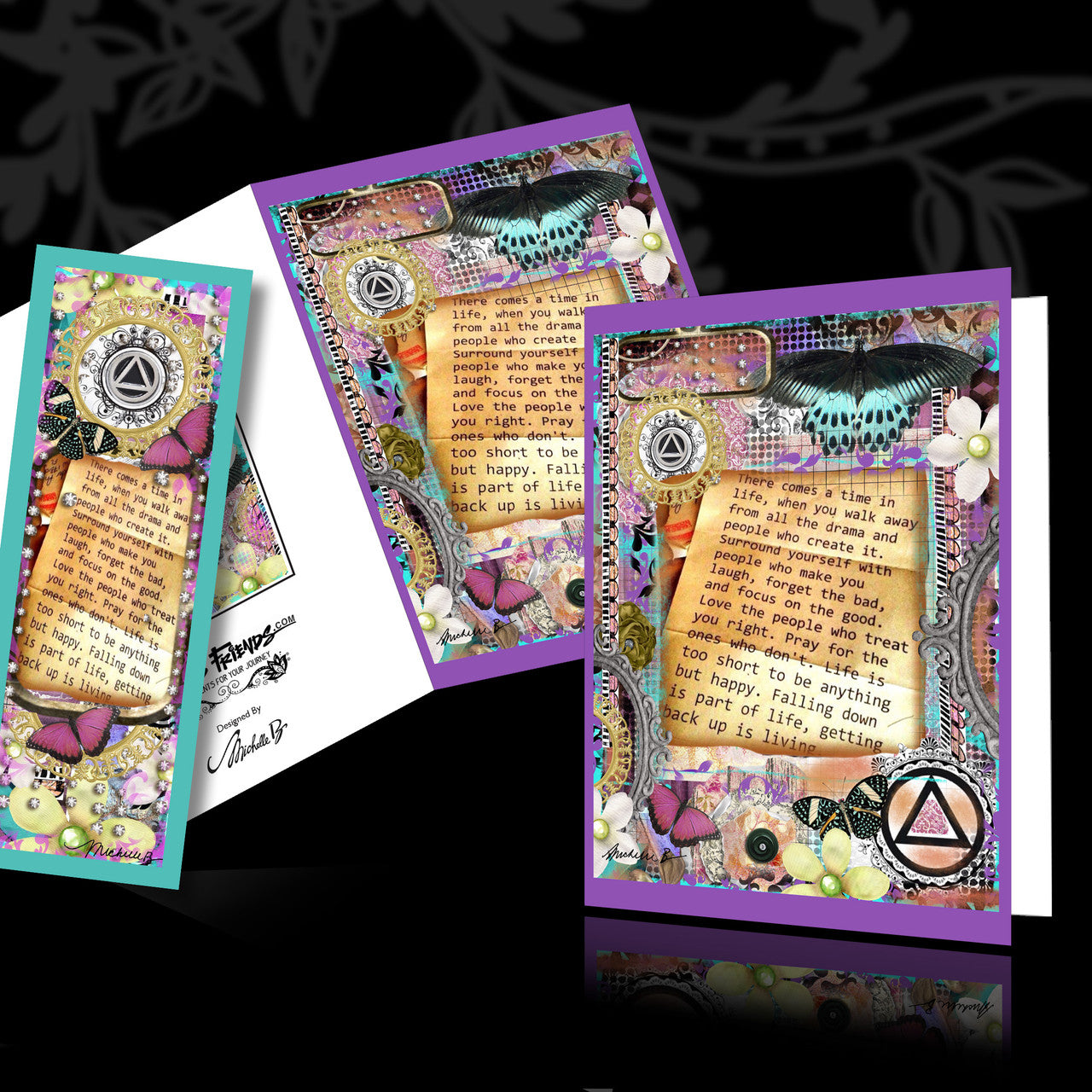 "Sentiments for your Journey" are designed by Michelle B with both the front and back decorated. The inside of the cards are left blank. Let us know if you would like us to include one for a gift with a message from you.