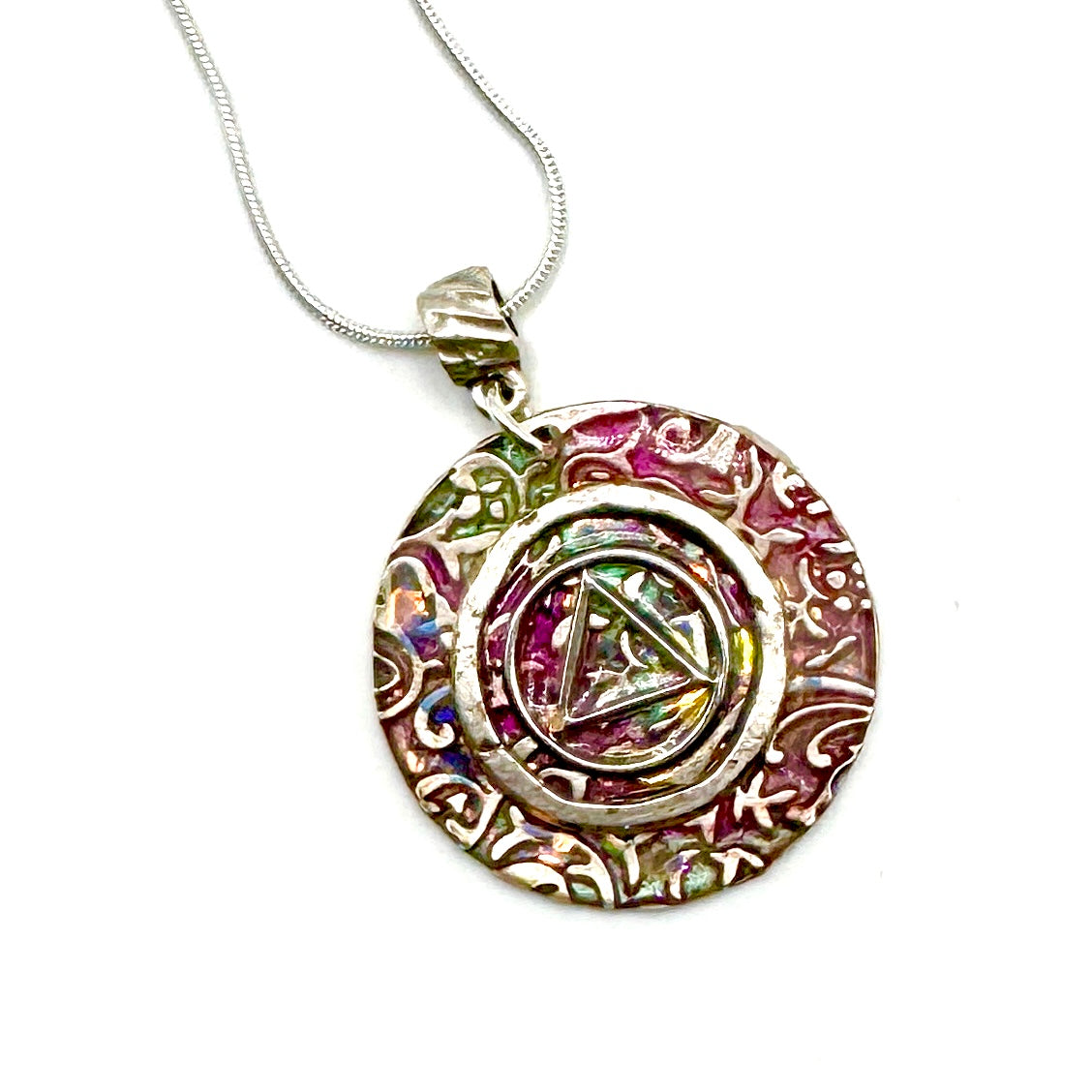 Silver plated 18” chain. This is a One of a Kind Pendant that’s sure to stand out!