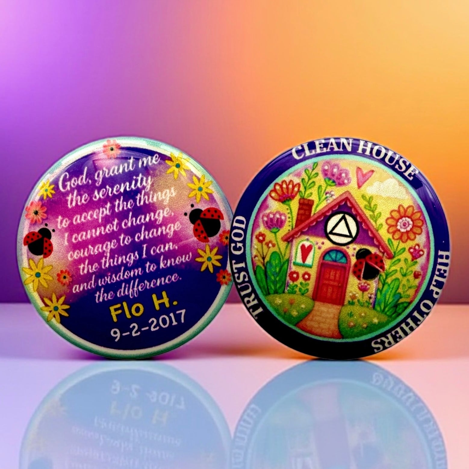 Personalized Sobriety Medallions with Name and Sobriety Date by Artist Michelle B are Meaningful Keepsakes and Make Great Gifts! These Truly are Original Pieces of Art for Yourself or Someone Special.