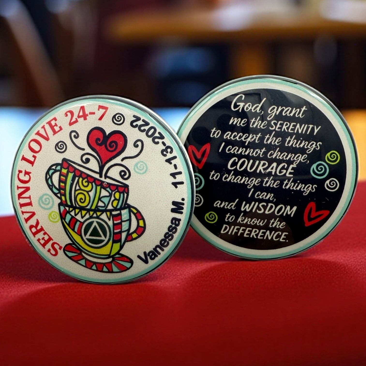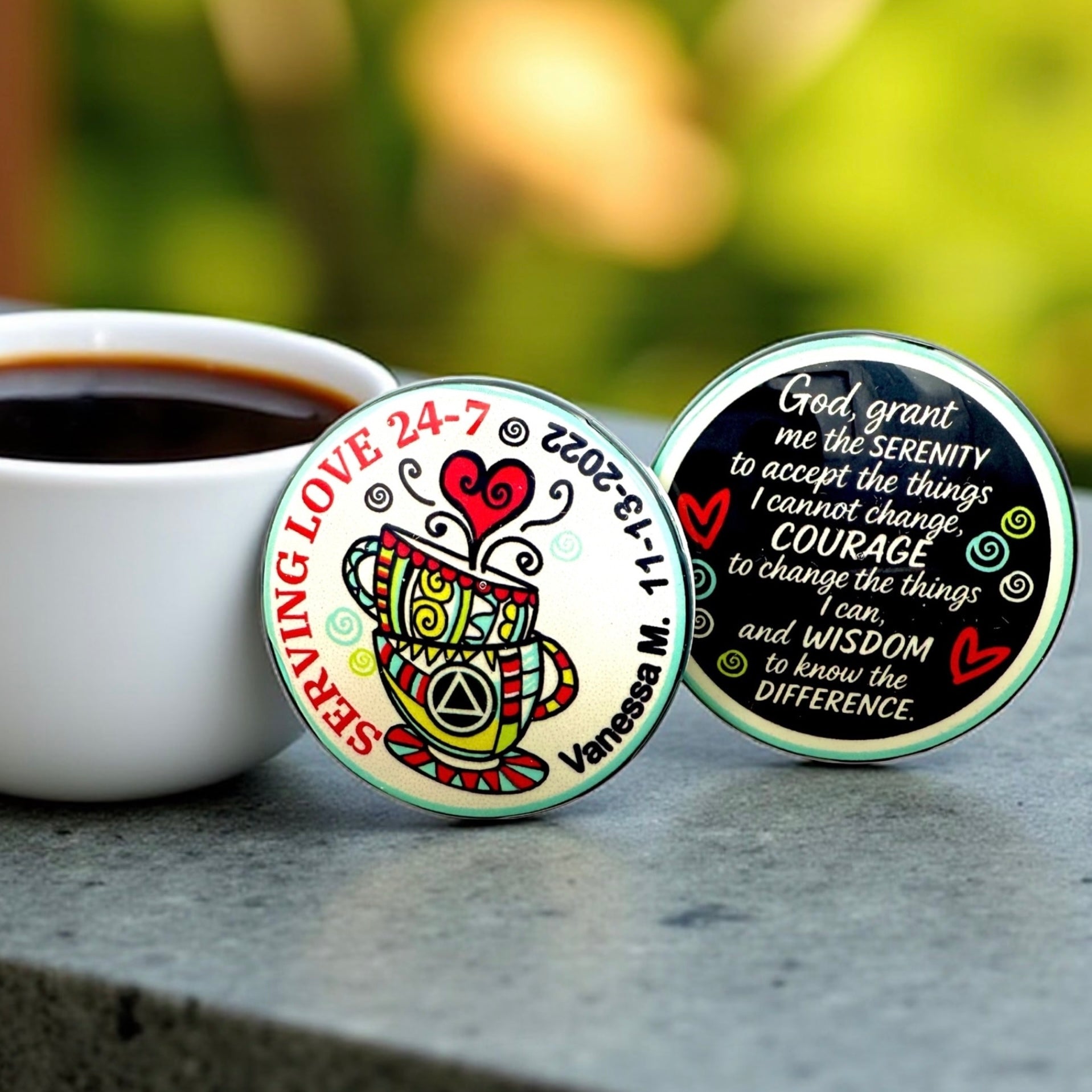 Personalized Sobriety Medallions with Name and Sobriety Date by Artist Michelle B are Meaningful Keepsakes and Make Great Gifts! These Truly are Original Pieces of Art for Yourself or Someone Special.