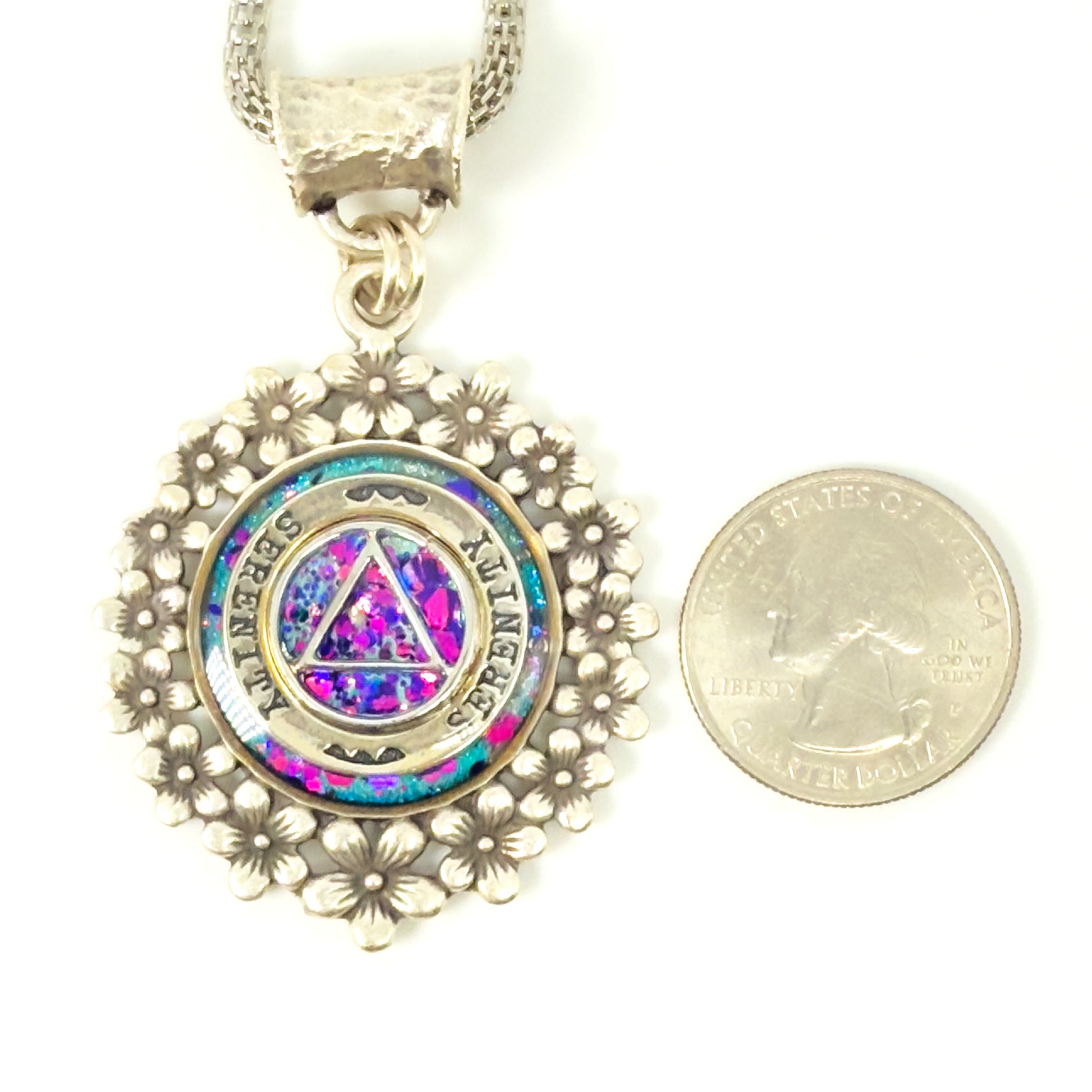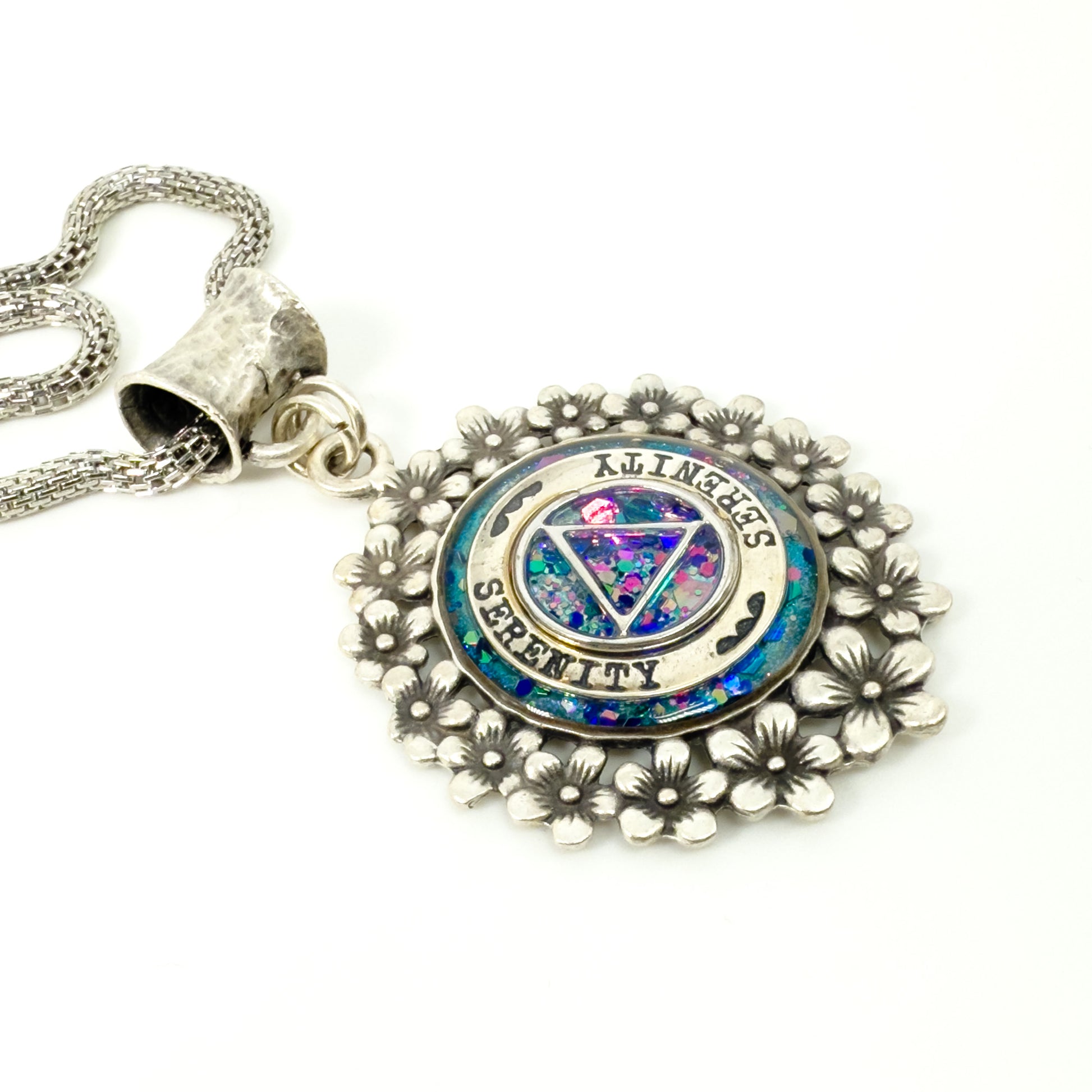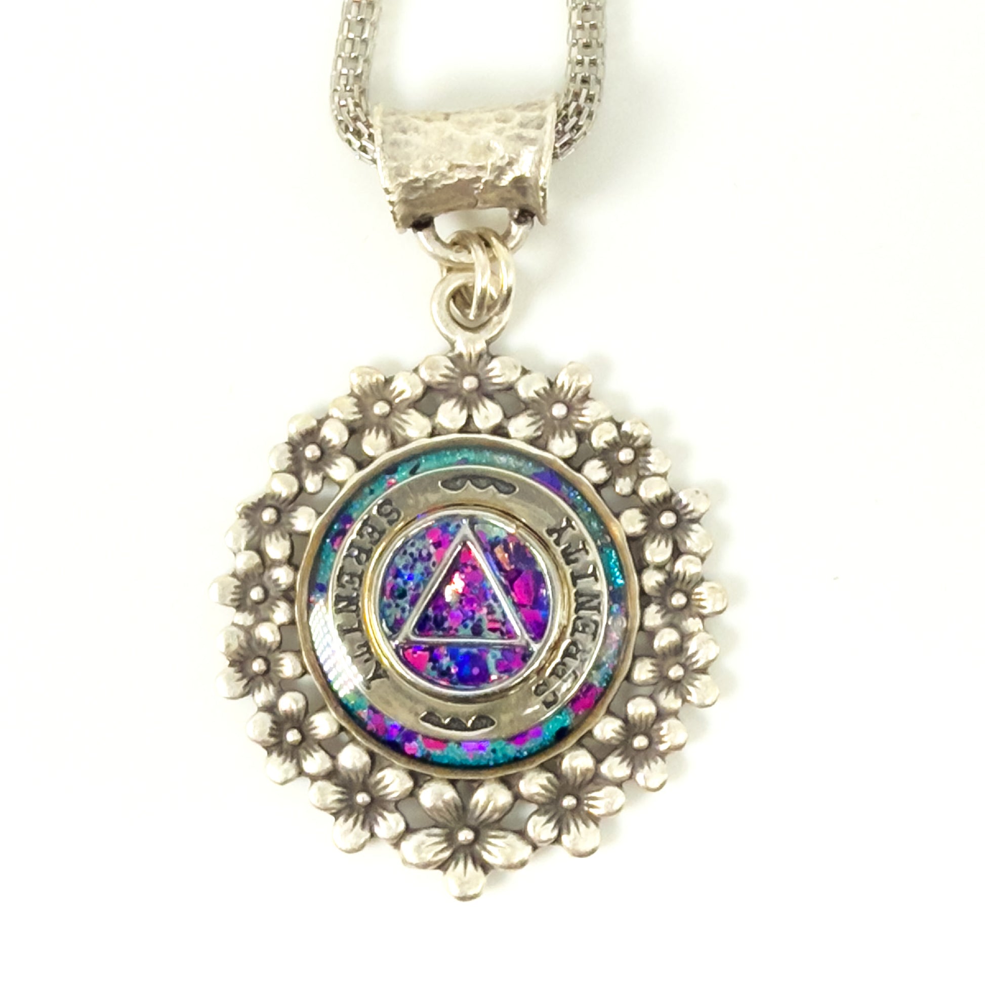 My One of a Kind Hand Painted Resin Sobriety Pendants are Unique, Handcrafted pieces of jewelry designed to symbolize and celebrate your journey in recovery. I incorporate many symbols in my work such as hearts. Hearts represent “My Heart is in Recovery” Each pendant comes with a 18” silver plated chain