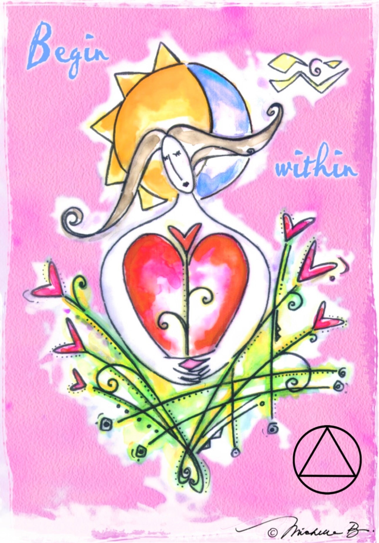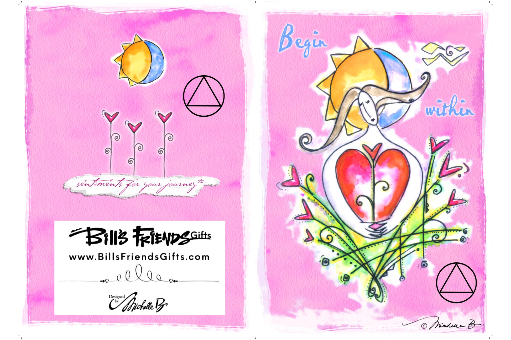 Michelle B’s artful greeting cards ( front and back) are specially designed. ( Blank inside for your special message). -Whether you're looking for a card to celebrate a milestone, provide comfort during challenging times, or simply to remind someone of their strength and resilience, these greeting cards and bookmarks are perfect! Each design is a work of art. Celebrate your own achievements or support someone special with a greeting card or bookmark that speaks to the heart and spirit of the 12-step program. All Greeting Cards are packaged in cellophane and professionally printed on heavy card stock. (blank inside)