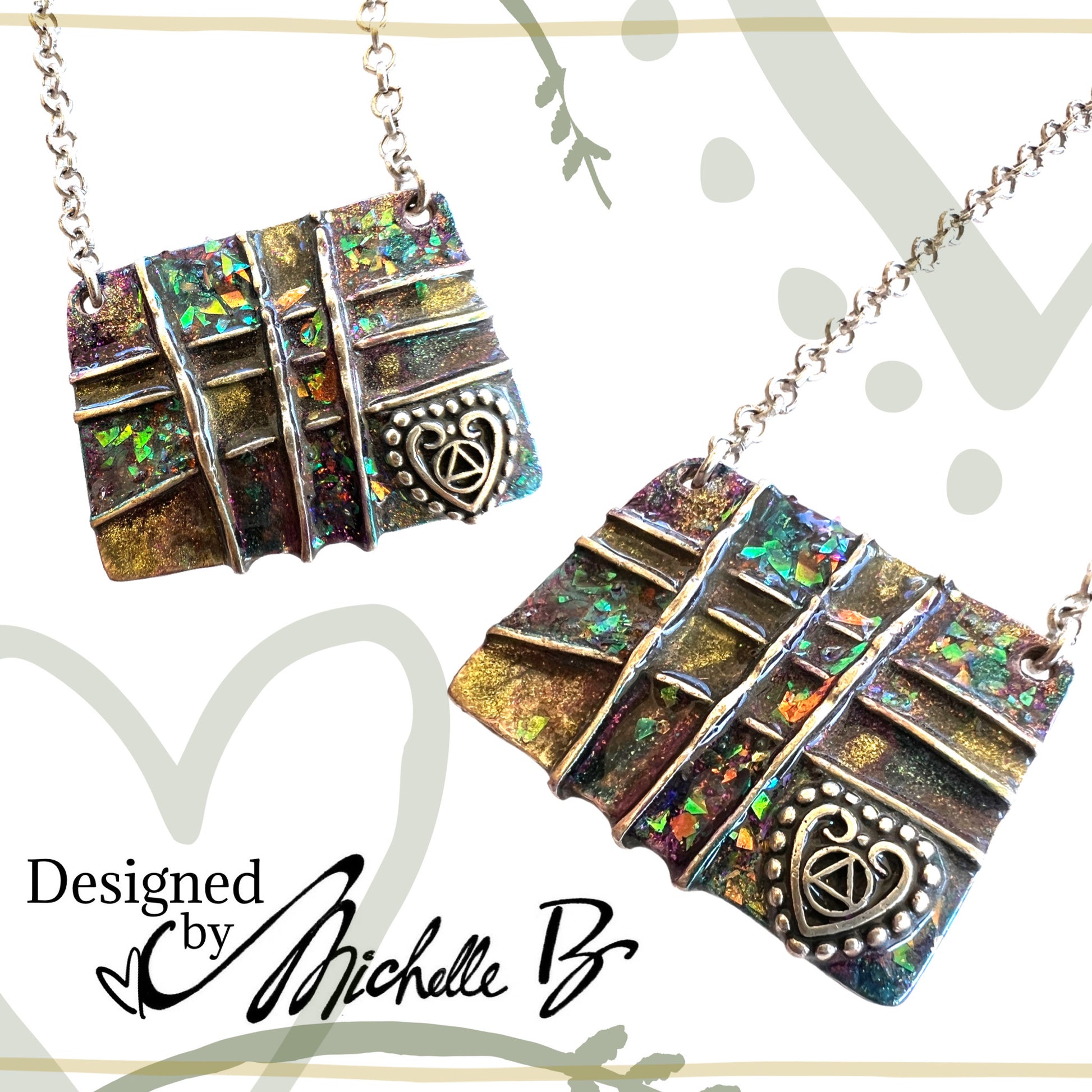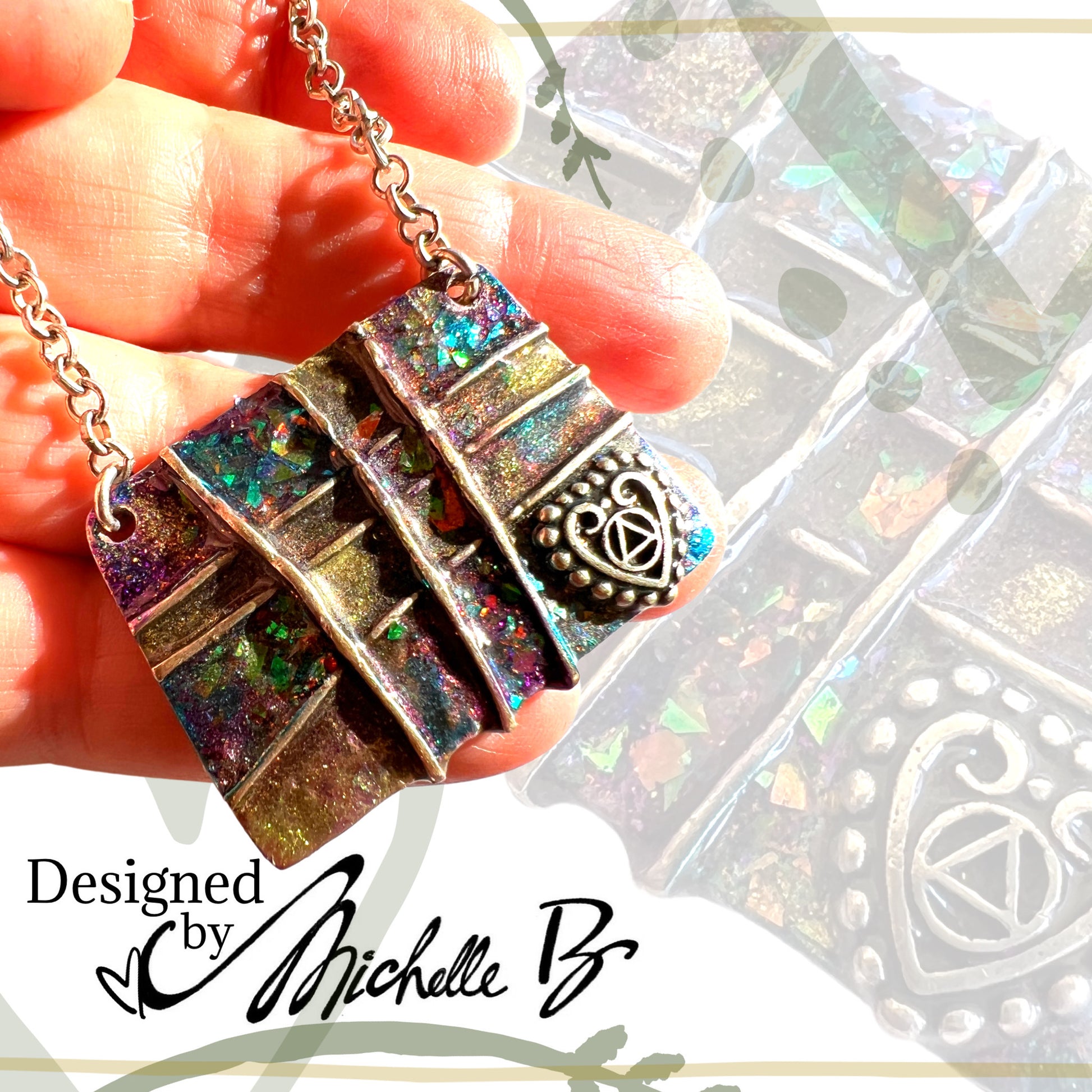 “Cross My Heart” is a Very colorful hand painted resin pendant - Truly One of a Kind ! This pendant displays Magical flecks of small iridescent flakes - Very sparkly and shimmery. Silver plated