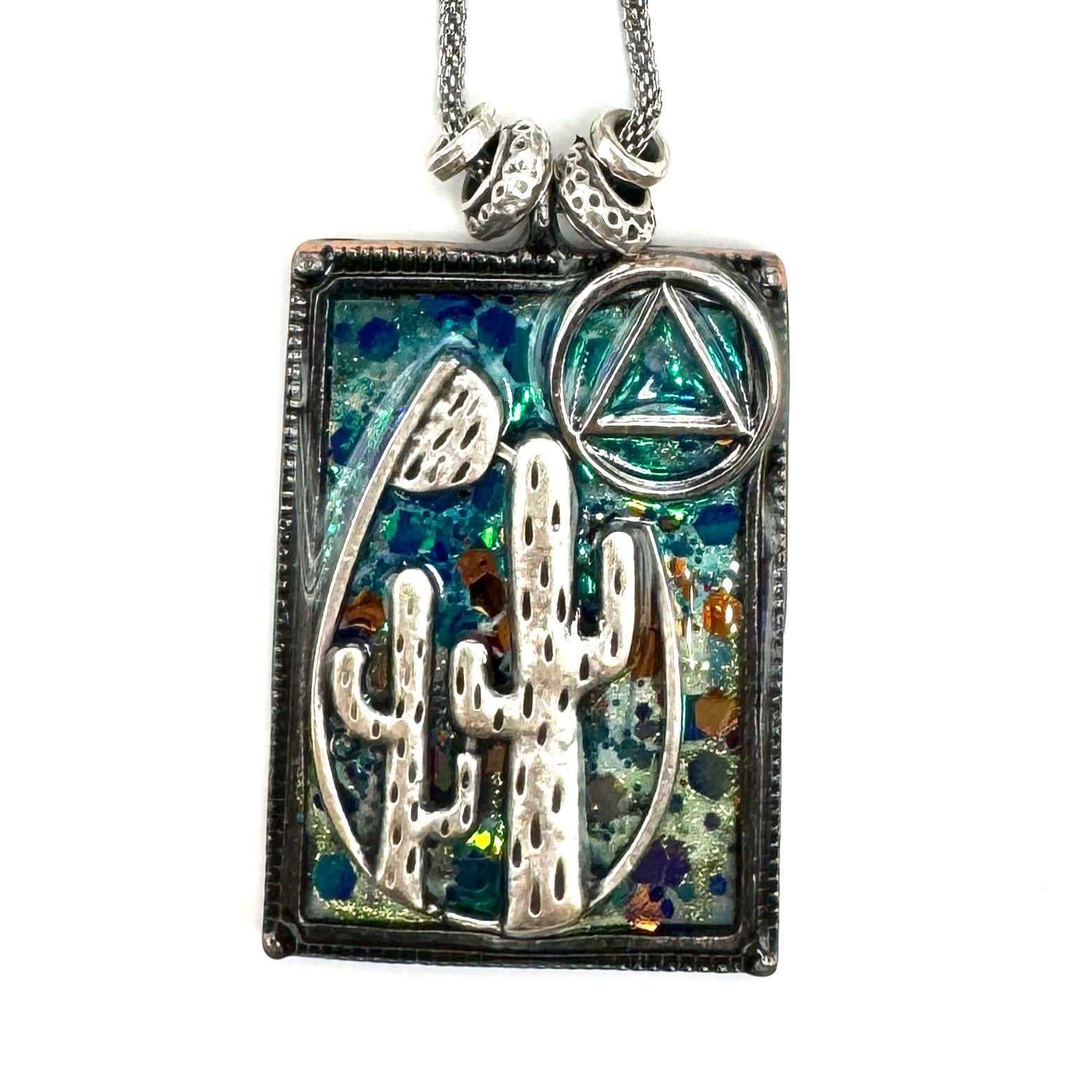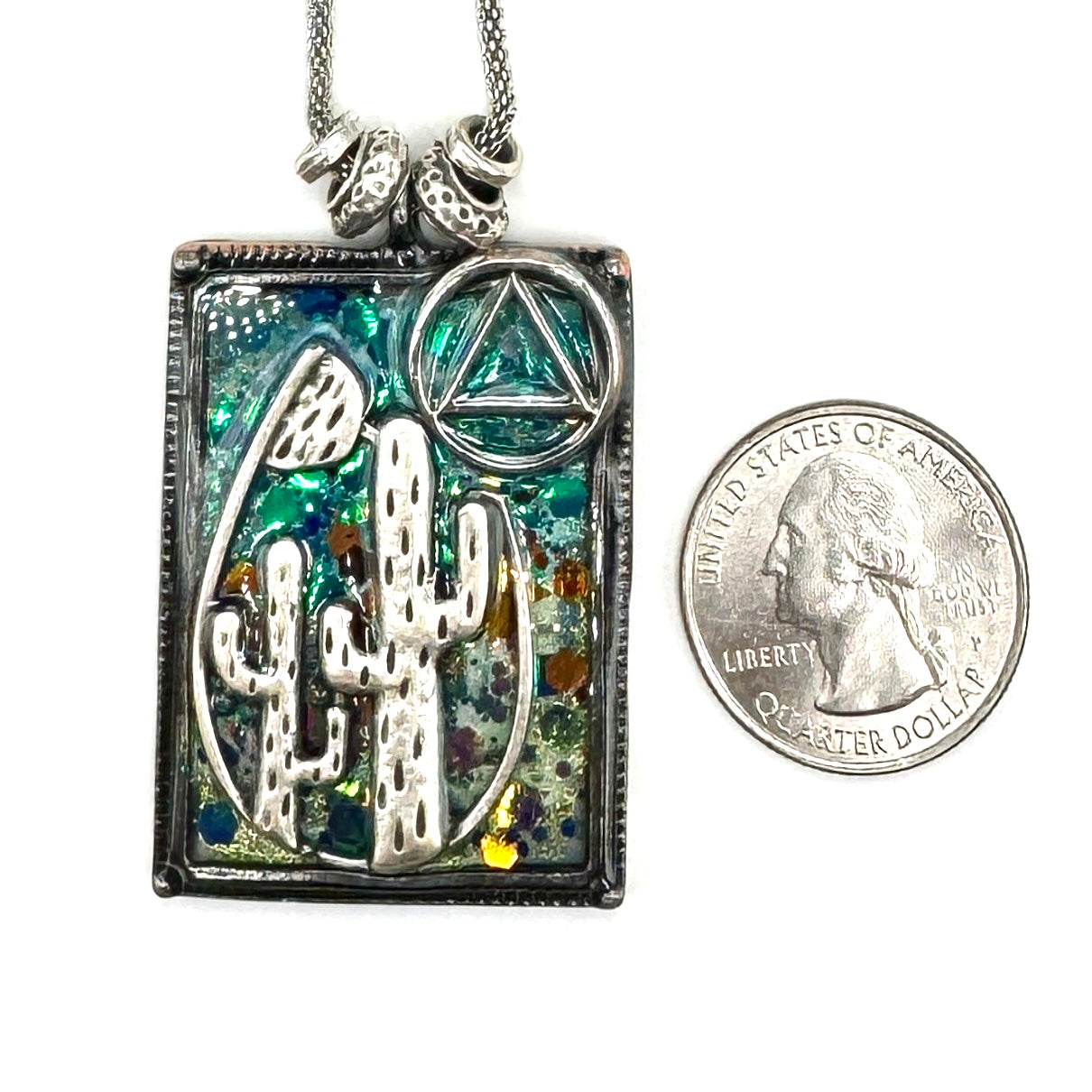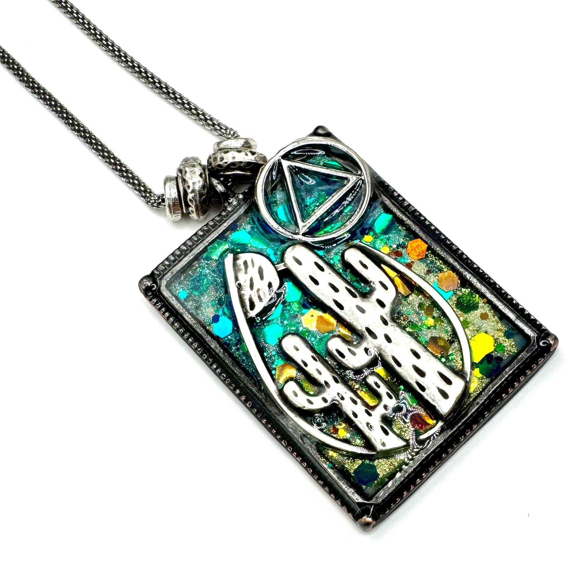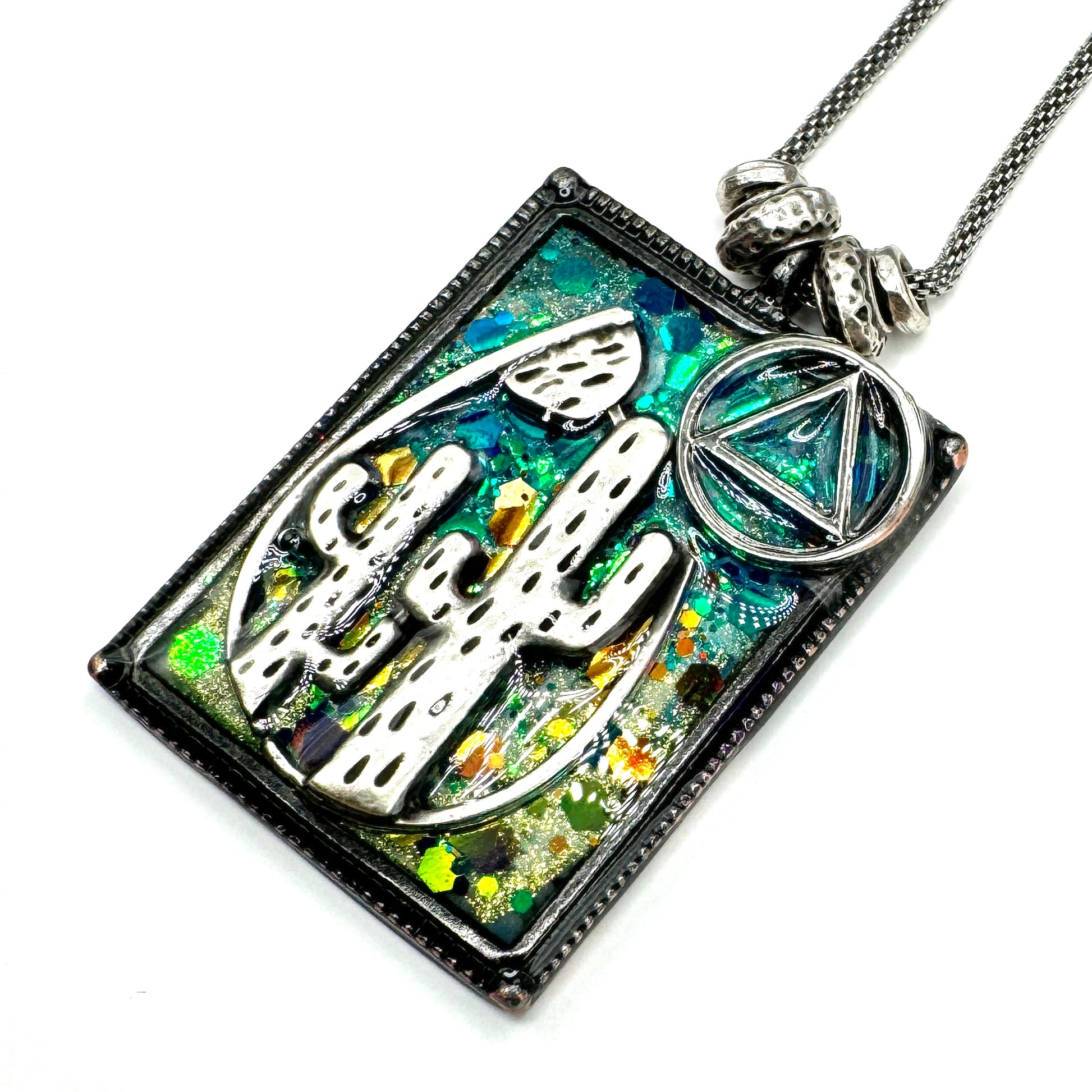 One-of a- Kind hand painted sobriety pendants are unique, handcrafted pieces of jewelry designed to symbolize and celebrate your journey in recovery. This pendant features saguaro cactuses reminiscent of the desert southwest.Hand painted with crystal clear resin by Michelle b