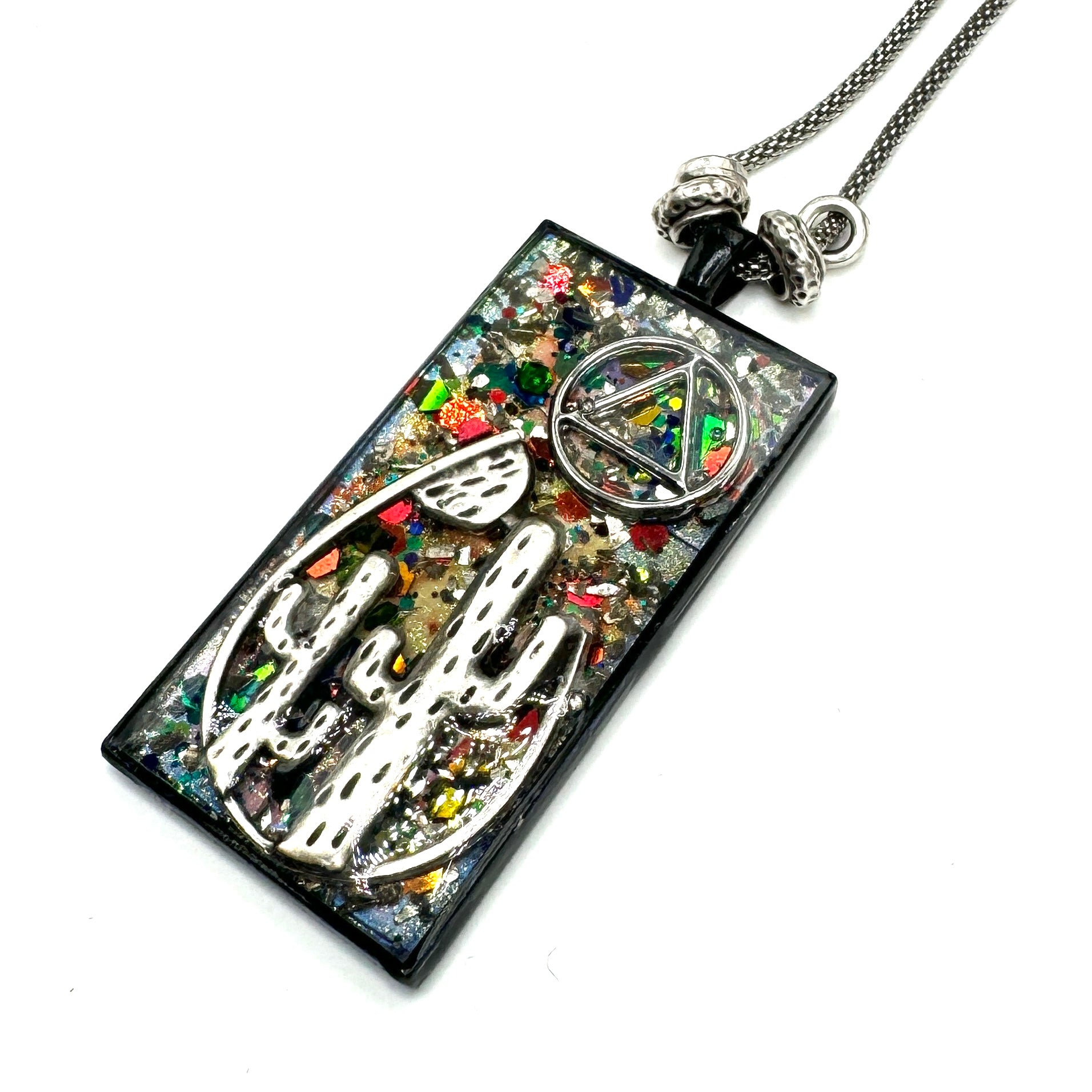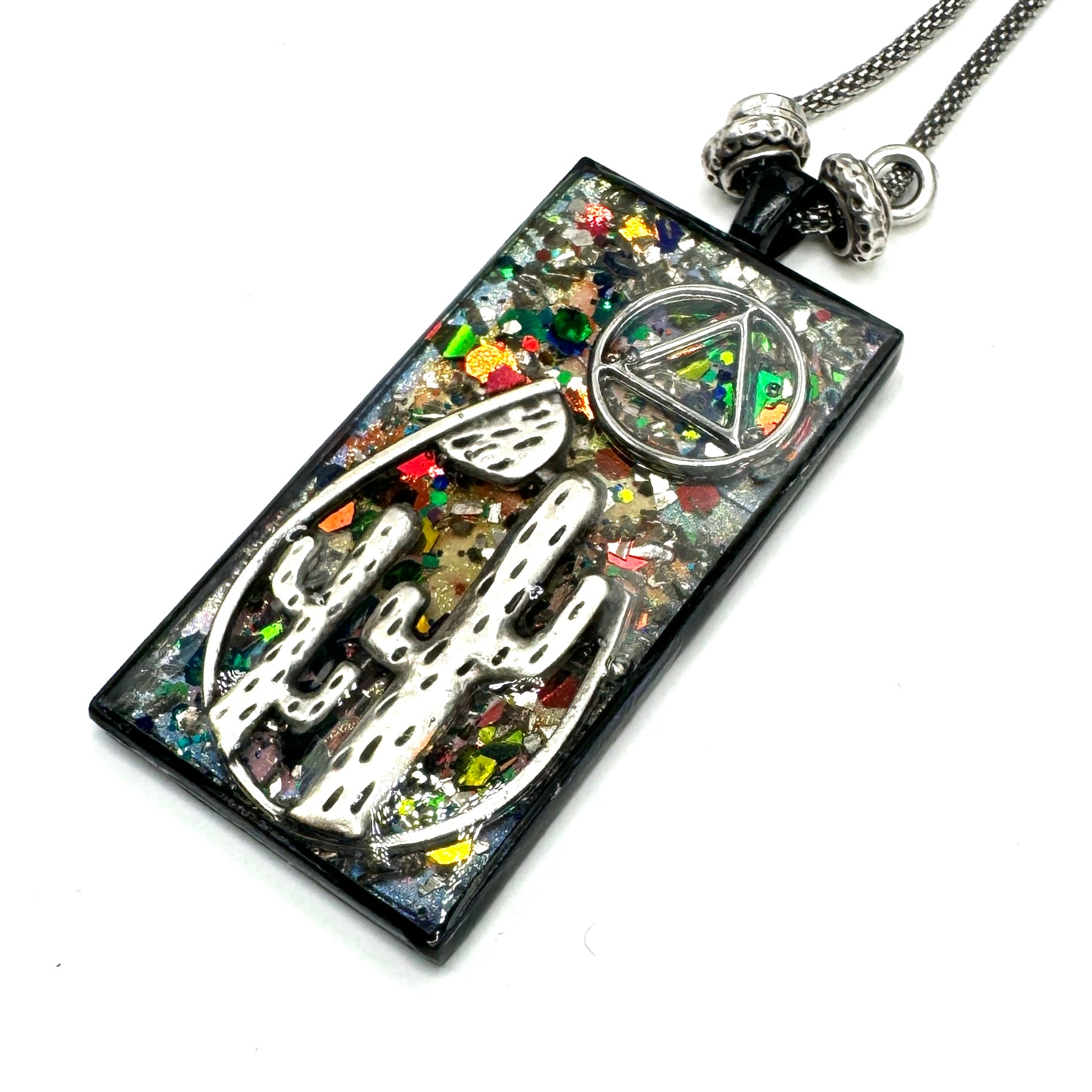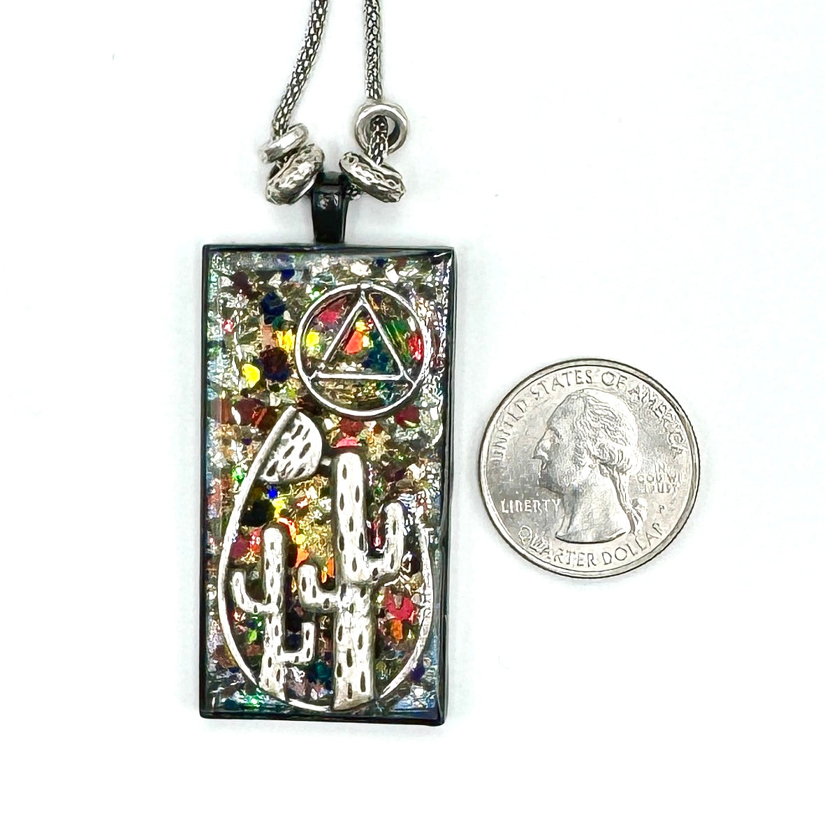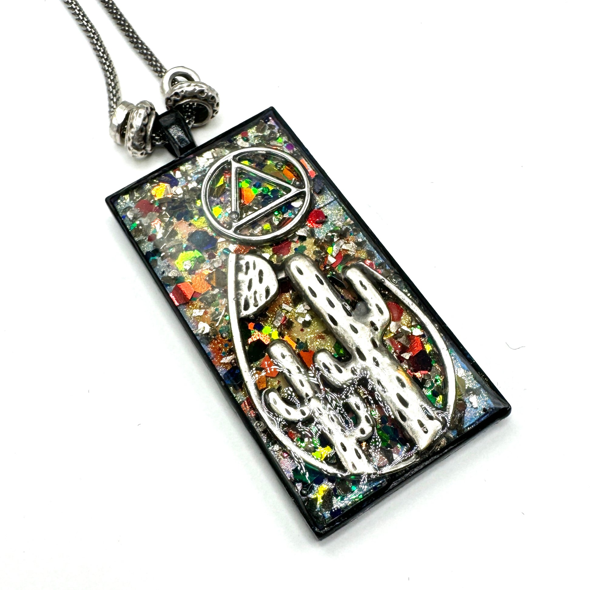 One-of a- Kind hand painted sobriety pendants are unique, handcrafted pieces of jewelry designed to symbolize and celebrate your journey in recovery. This pendant features saguaro cactuses reminiscent of the desert southwest.Hand painted with crystal clear resin by Michelle b