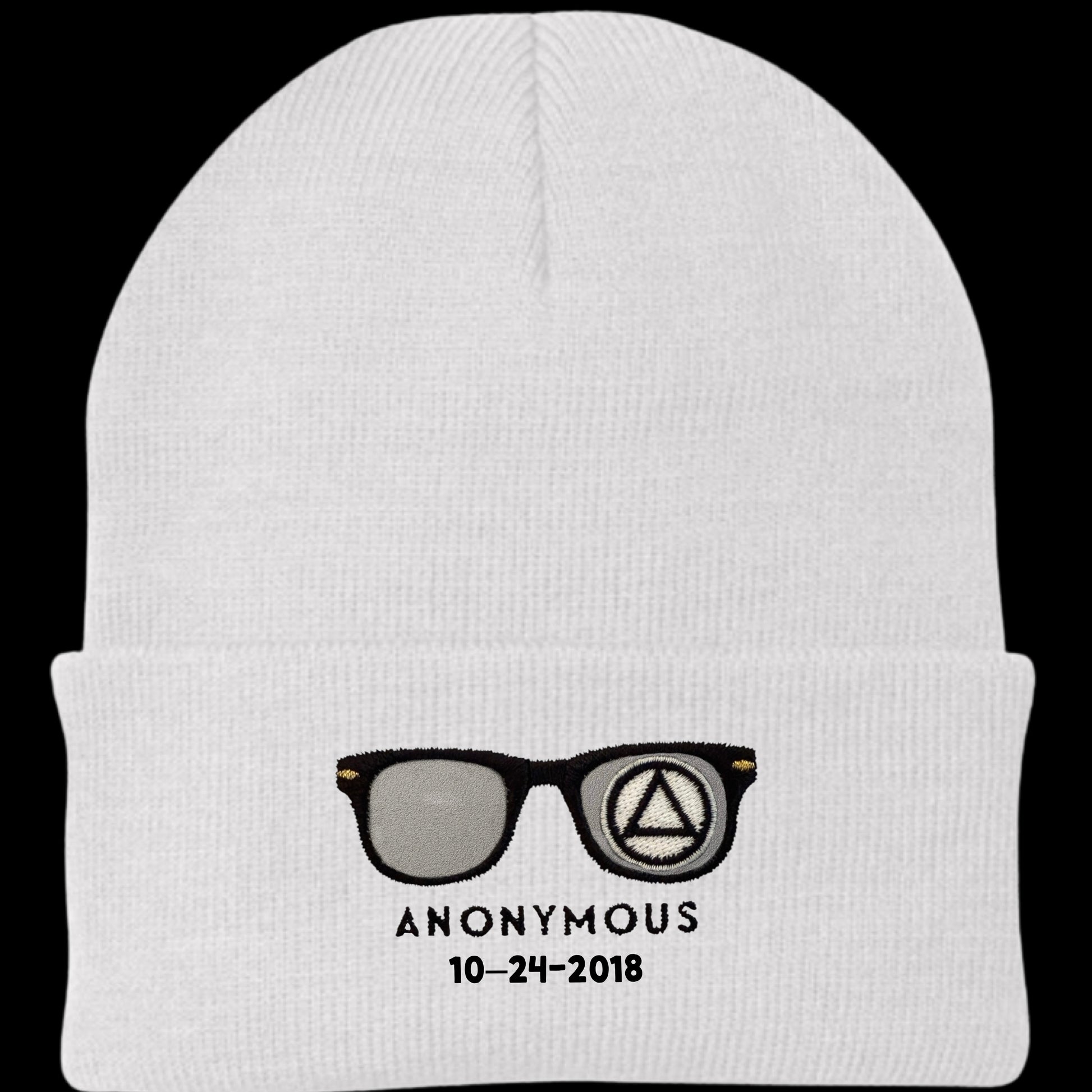 Embroidered Anonymous White Knit Cap With Or Without Sobriety Date