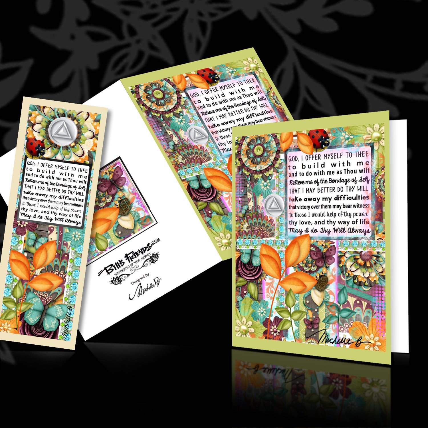 Michelle B’s artful greeting cards ( front and back) are specially designed. ( Blank inside for your special message). -Whether you're looking for a card to celebrate a milestone, provide comfort during challenging times, or simply to remind someone of their strength and resilience, these greeting cards and bookmarks are perfect! Each design is a work of art. Celebrate your own achievements or support someone special with a greeting card or bookmark that speaks to the heart and spirit of the 12-step program. All Greeting Cards are packaged in cellophane and professionally printed on heavy card stock. (blank inside).