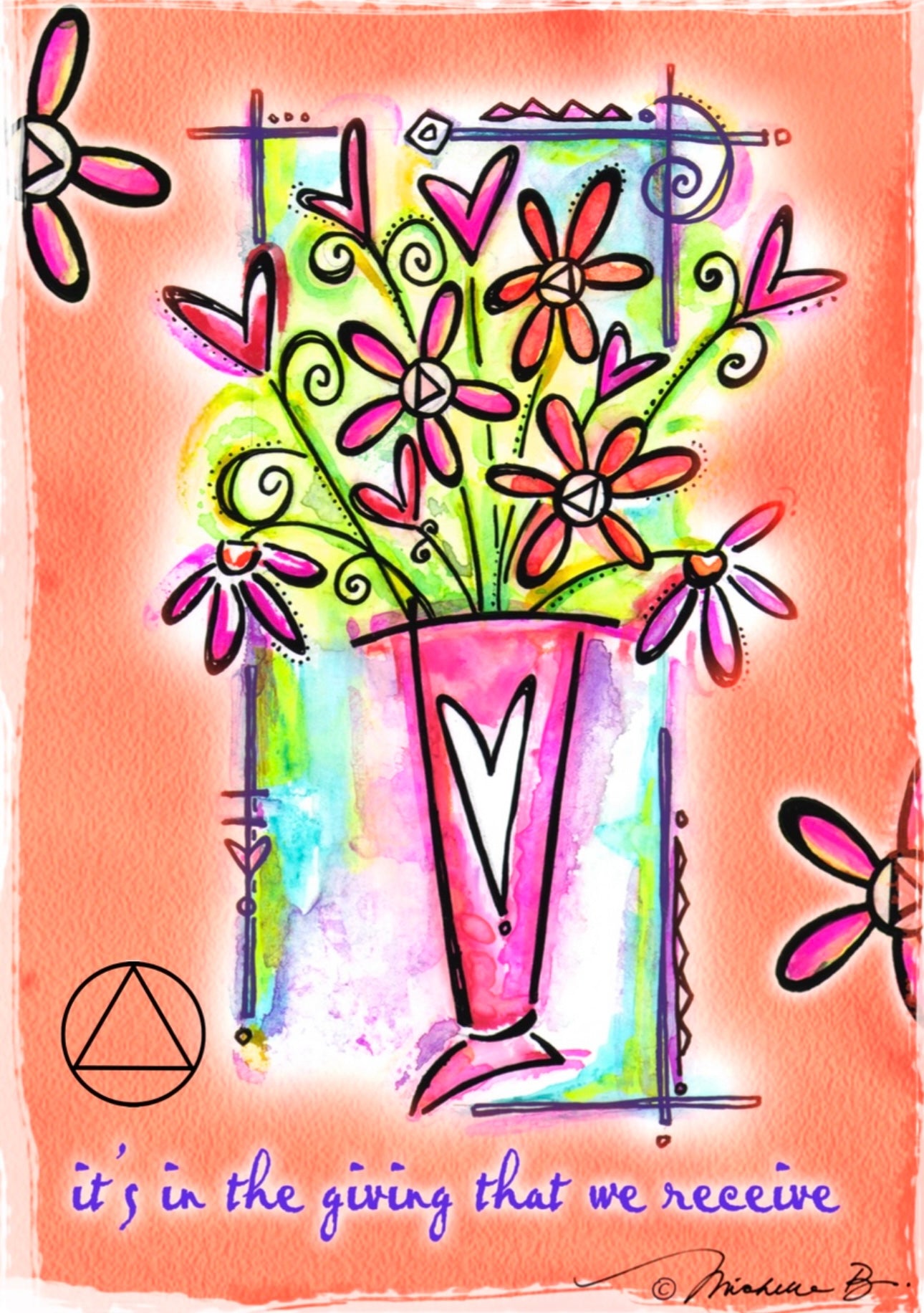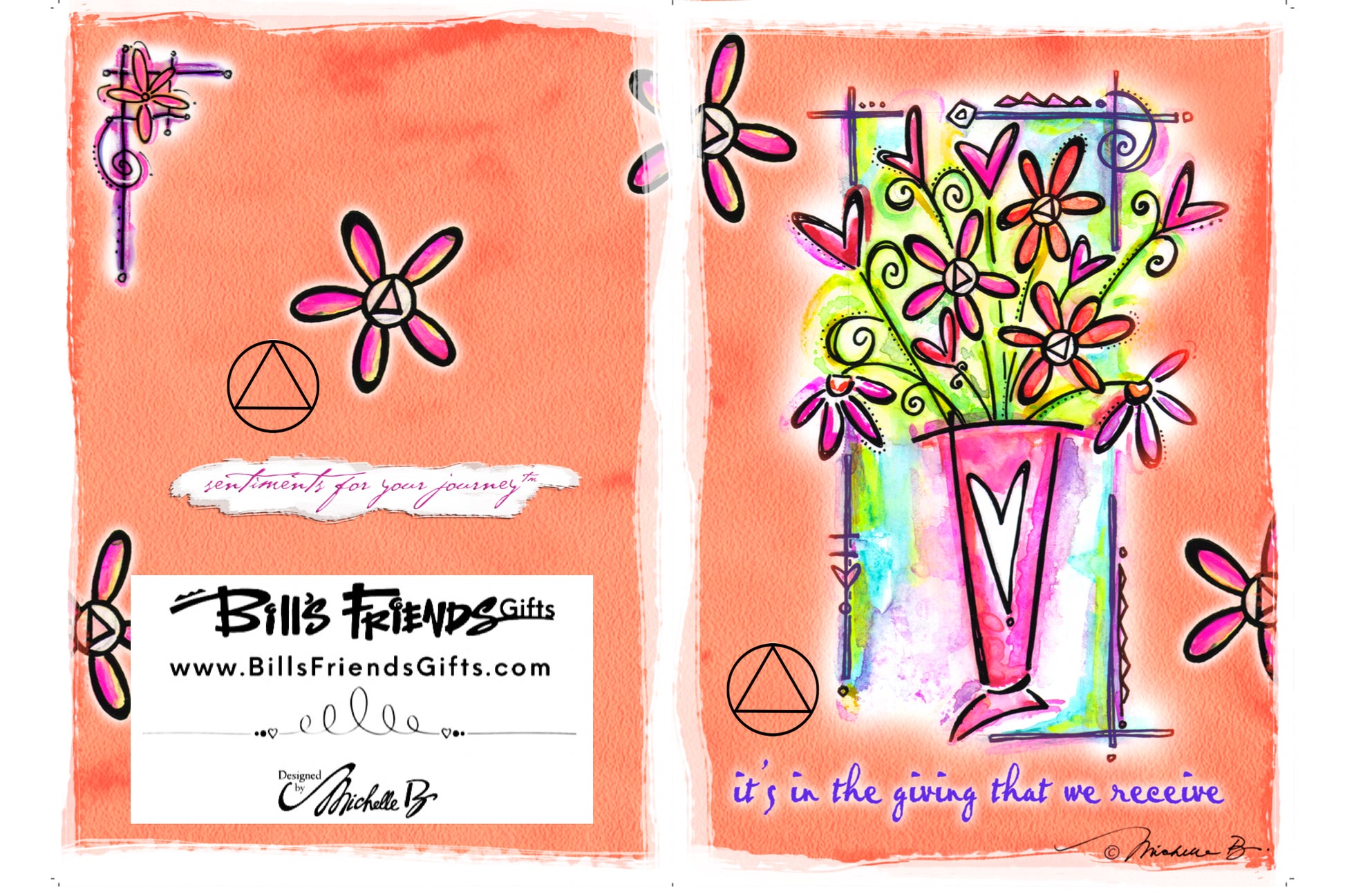 Michelle B’s artful greeting cards ( front and back) are specially designed. ( Blank inside for your special message). -Whether you're looking for a card to celebrate a milestone, provide comfort during challenging times, or simply to remind someone of their strength and resilience, these greeting cards and bookmarks are perfect! Each design is a work of art. Celebrate your own achievements or support someone special with a greeting card or bookmark that speaks to the heart and spirit of the 12-step program. All Greeting Cards are packaged in cellophane and professionally printed on heavy card stock. (blank inside)