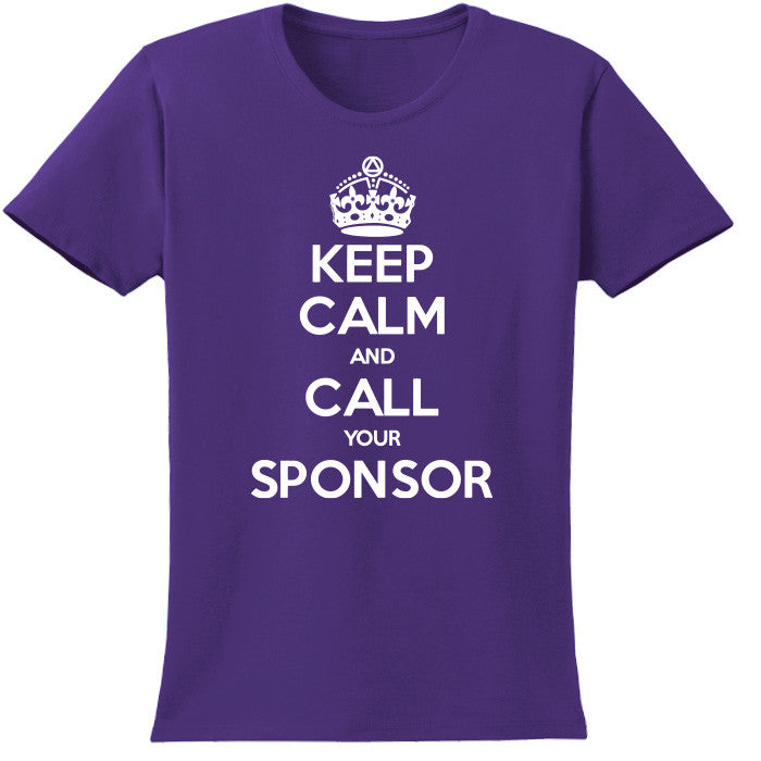 Keep Calm….And Call Your Sponsor! Printed on a Women’s Cut Purple Tee.