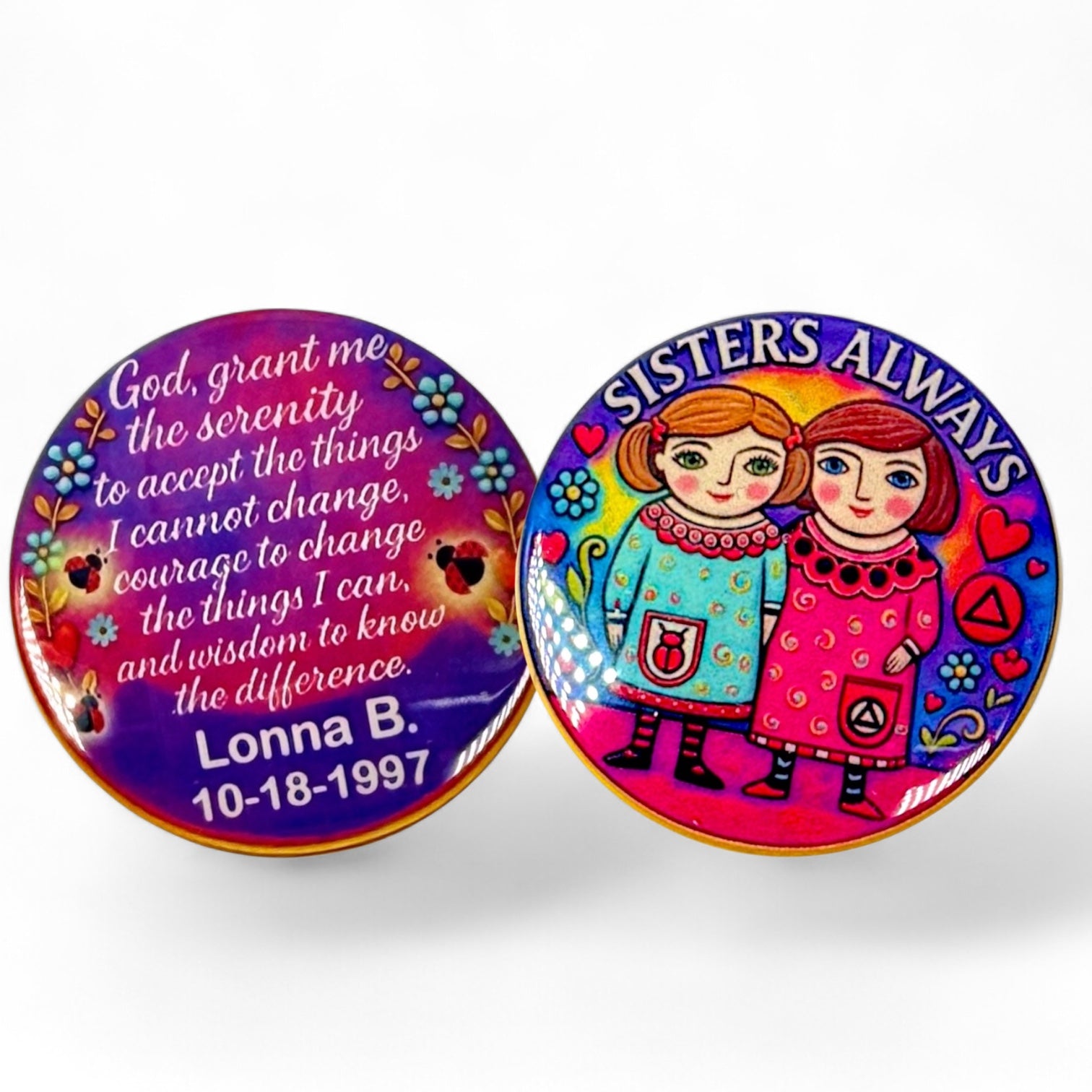 Personalized Sobriety Medallions with Name and Sobriety Date by Artist Michelle B are Meaningful Keepsakes and Make Great Gifts! These Truly are Original Pieces of Art for Yourself or Someone Special.