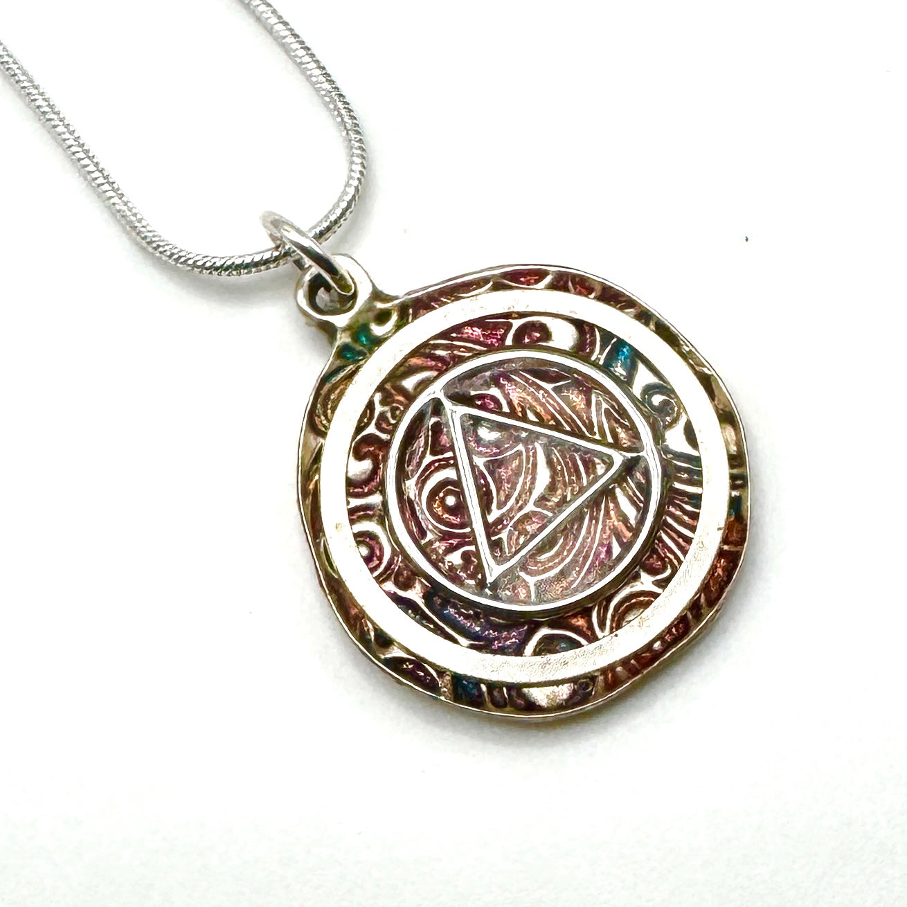 Silver plated 18” chain. This is a One of a Kind Pendant that’s sure to stand out!