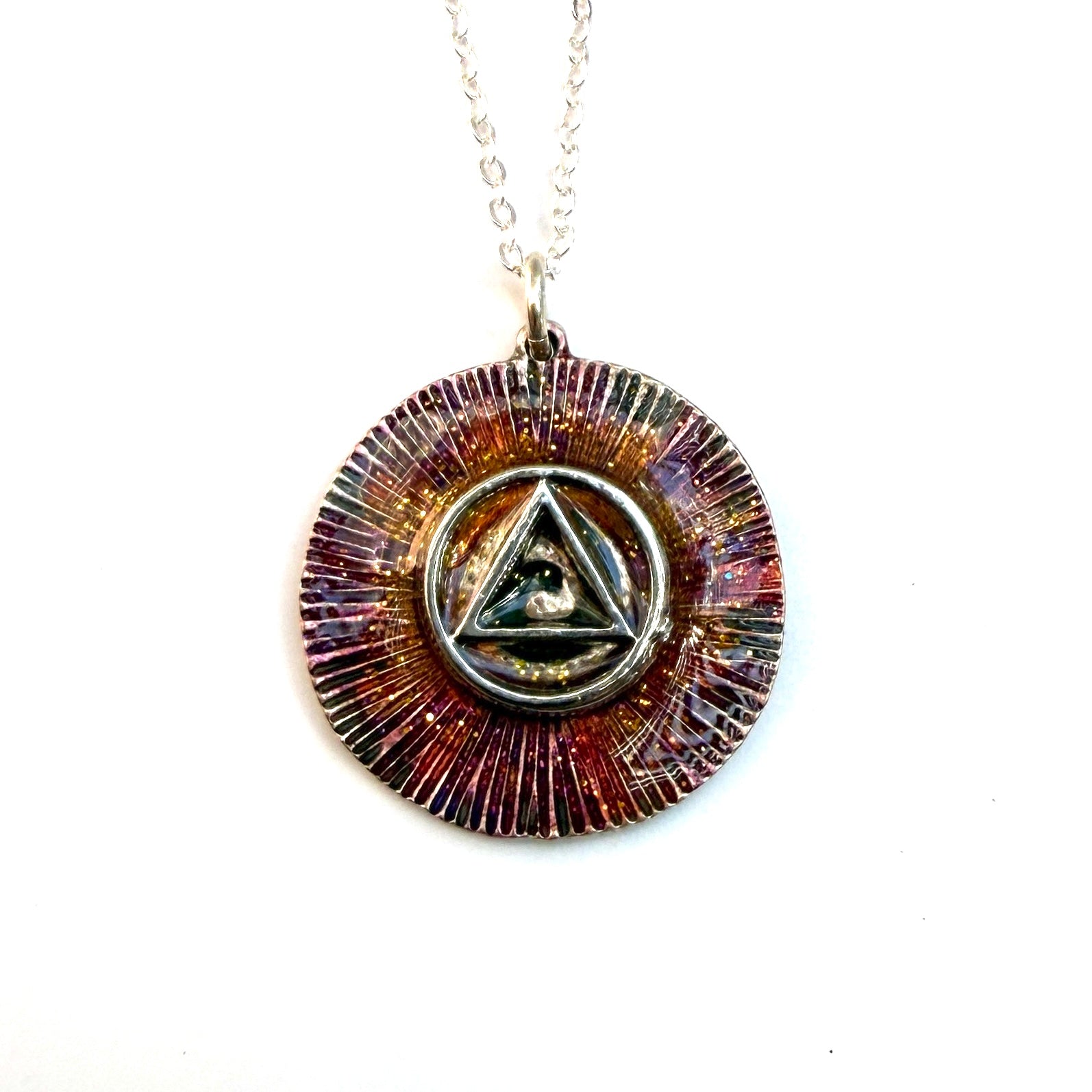 Silver plated 18” chain. This is a One of a Kind Pendant that’s sure to stand out!
