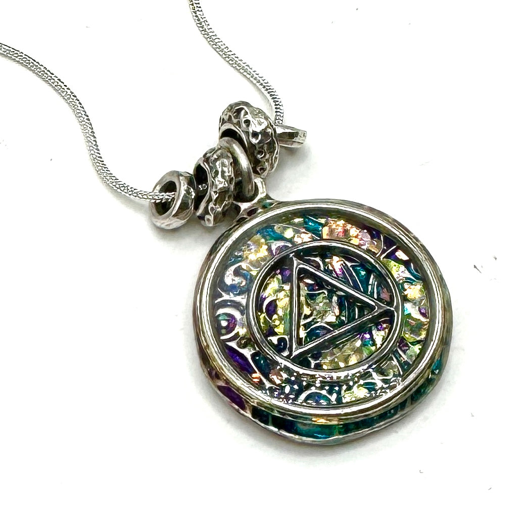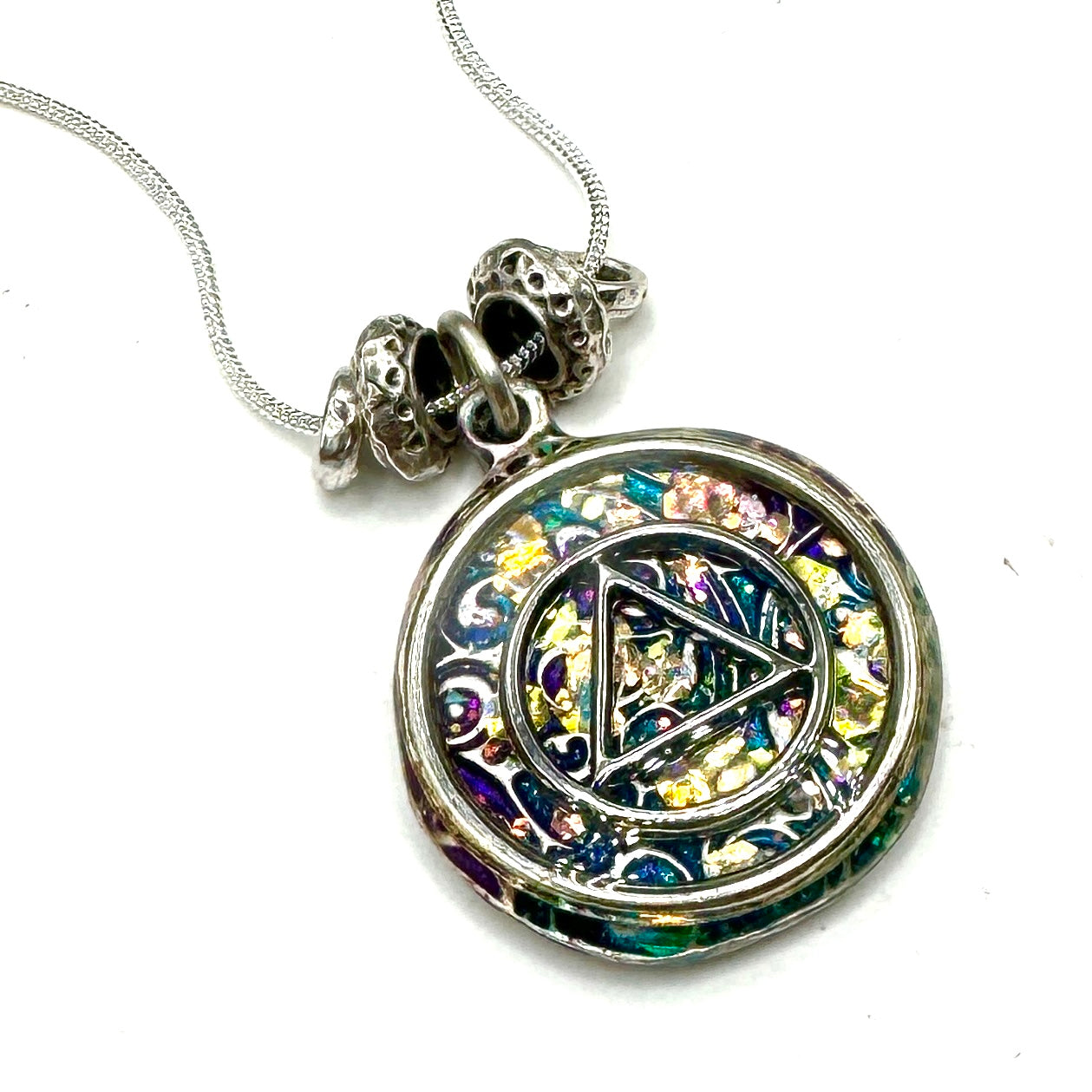 Silver plated 18” chain. This is a One of a Kind Pendant that’s sure to stand out!