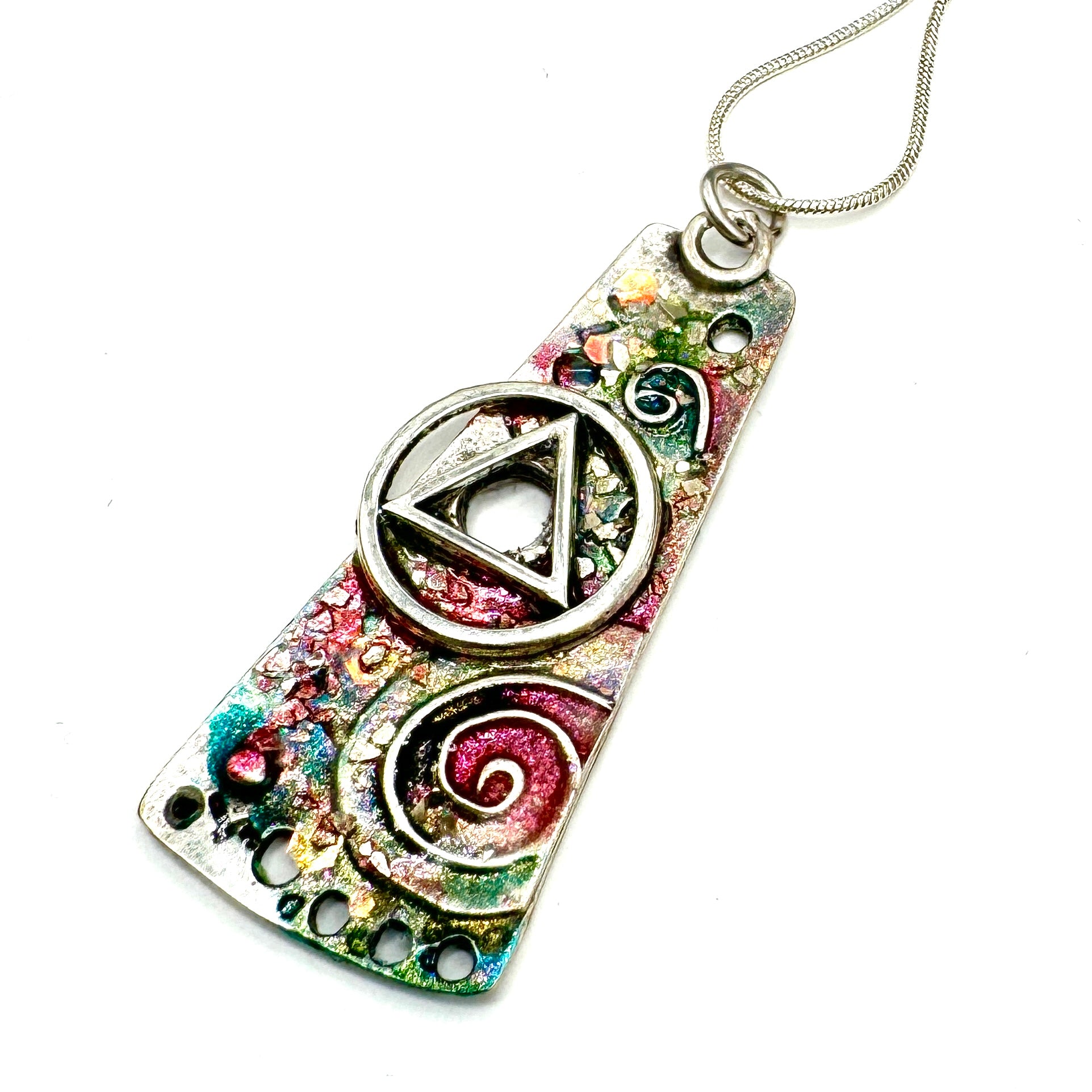 Silver plated 18” chain. This is a One of a Kind Pendant that’s sure to stand out!